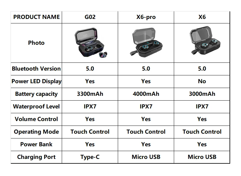 О нас, мы новый магазин. Мы хотим предоставить вам лучшее качество продукции и услуг. В качестве подарка в первый раз, пожалуйста, возьмите купон для покупки. Возможно, вы можете нажать, чтобы стать поклонником нашего магазина, мы доставим вам больше качественных товаров в первый раз. Надеюсь, вы дадите нам оценку в пять звезд после получения товара. Характеристики продукта: Версия Bluetooth: 5,0 Емкость аккумулятора наушников: 70 мАч полимерный литиевый аккумулятор Продолжительность вызова: около 4 часов Прослушивание Композиции: около 4 часов Время зарядки наушников: около 1 часа Время зарядки: около 2 часов Степень водонепроницаемости: IPX7 Время работы в режиме ожидания: 120 часов Время зарядки наушников: около 50 минут Время зарядки: около 1,5 часов Кнопка: сенсорная кнопка Основные черты: 1.IPX7 из водонепроницаемого материала 2. Громкость вверх и вниз 3. Передача Bluetooth 5,0 более стабильная, быстрая и низкое энергопотребление 4. Простота управления: одна кнопка пауза/воспроизведение/ответ/отбой, двойное нажатие для запуска siri/отбой, длительное нажатие 2 секунды вверх и вниз 5. Интеллектуальный дыхательный свет (контролируемый переключатель) 6. Откройте крышку и избавьтесь от ручного, автоматическая загрузка сопряжения обратно 7,3300 мАч (X6-pro 4000 мАч и X6 3000 мАч) Большая емкость зарядного устройства, может заряжать телефон Упаковочный лист: 2 * беспроводные наушники 1 * кабель для зарядки 1 * зарядный чехол 1 * Руководство по использованию