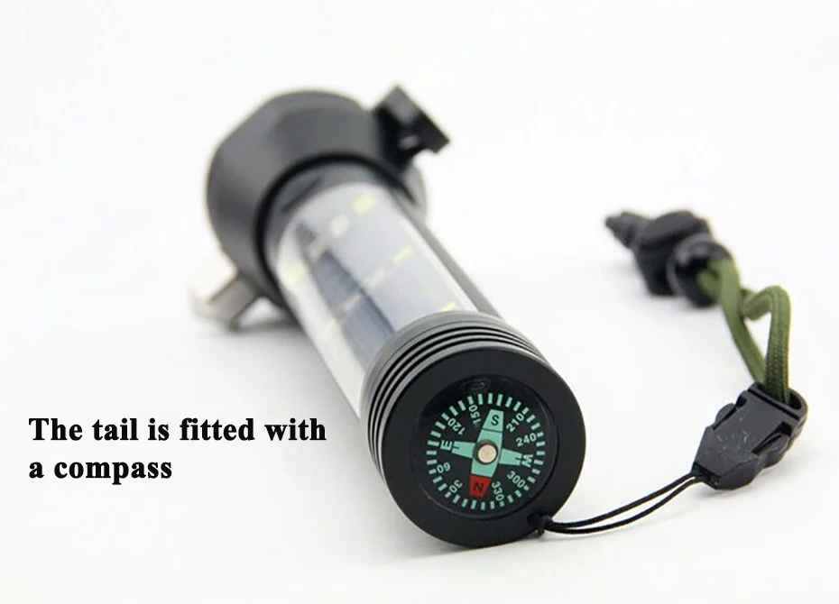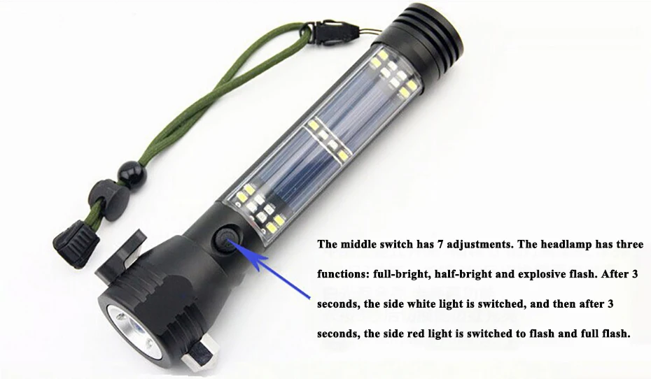 Наименование товара: светодиодный фонарик с солнечной батареей и спасательными инструментами Продукт Особенности: Материал: алюминиевый сплав Размер: 197x45 мм Вес: 305 г Источник света: 1*3 Вт светодиодный (головка) + 10*2835 Светодиодный (красный свет) + 10*2835 Светодиодный (белый свет) Яркость: 150 люмен (головка 3 Вт) Мощность аккумулятора: 2000 MAH 18650 литиевая батарея (5 V 50MA солнечные панели) Тип переключателя: Нажмите кнопку Время работы: фара (высокий свет 2-3 часа, средний свет 5-6 часов, Вспышка 5-6 часов). Боковой белый свет (полный свет 3-4 часа. Половина света 6-7 часов). Боковой красный свет (быстрая вспышка 6-7 часов, медленная вспышка 6-7 часов) Сертификат: CE & ROHS Расстояние луча: 200 м (фара) Входное напряжение (интерфейс USB): 5 В Выходное напряжение (интерфейс USB): 5 В (зарядка для мобильного телефона) 1. слева от головки с высокой твердостью сплава безопасности молоток, может легко сломать окно 2. справа от головки с режущим ножом, в случае аварийной ситуации можно использовать для резки пояса для побега. 3. головка с сильным магнитом, может быть легко адсорбирована на автомобильном корпусе или железные детали. 4 хвоста с компасом