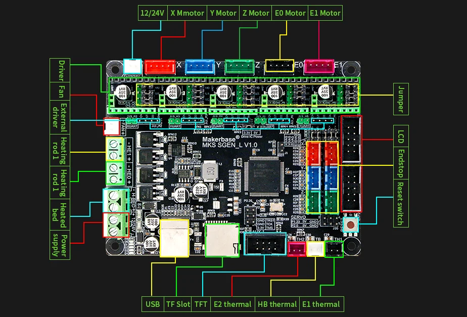 MKS-SGEN_L is a 3D printer ARM motherboard by Makerbase. It uses a 32-bit Cortex-M3 LPC 1768 processor , running frequency is up to 100 MHz. It can be compatible with Smoothieware and Marlin 2.0 firmware. It support in-line drivers and external drivers. And the in-line driver is compatible with various modes (uart, spi, etc.). It is compatible with multiple LCD screens and MKS series touch screens. It is a versatile and cost-effective motherboard.