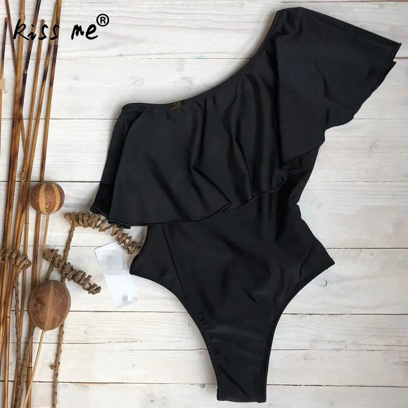 Женский цельный купальник на одно плечо, черный однотонный купальник без косточек, сексуальный Монокини, пляжная одежда