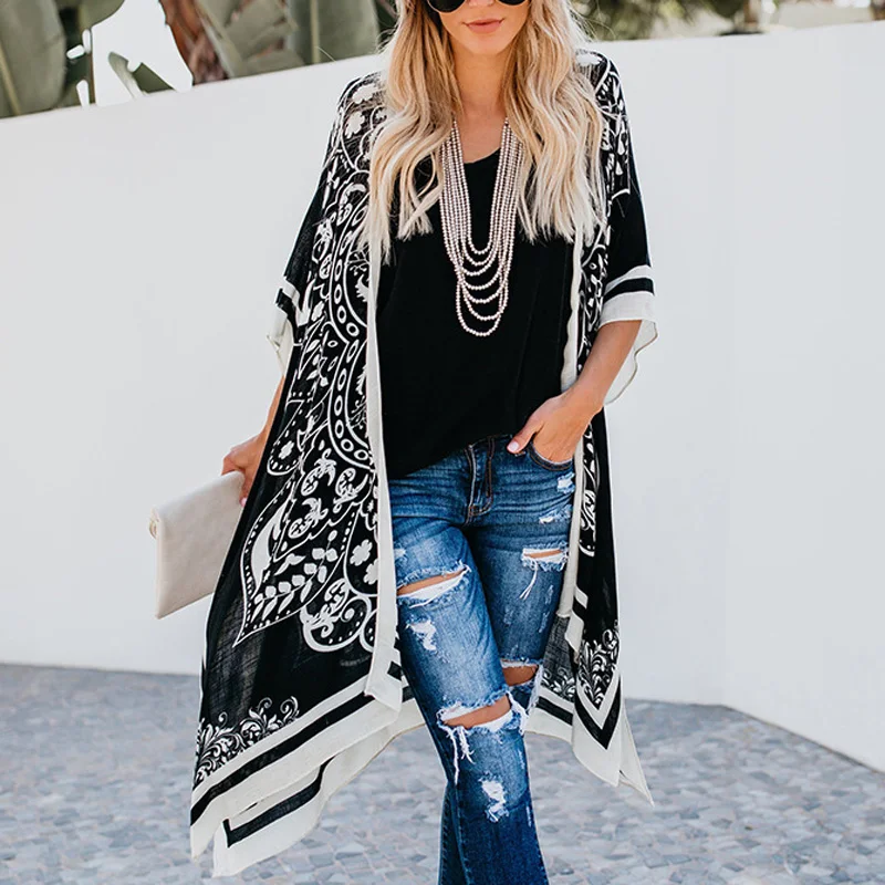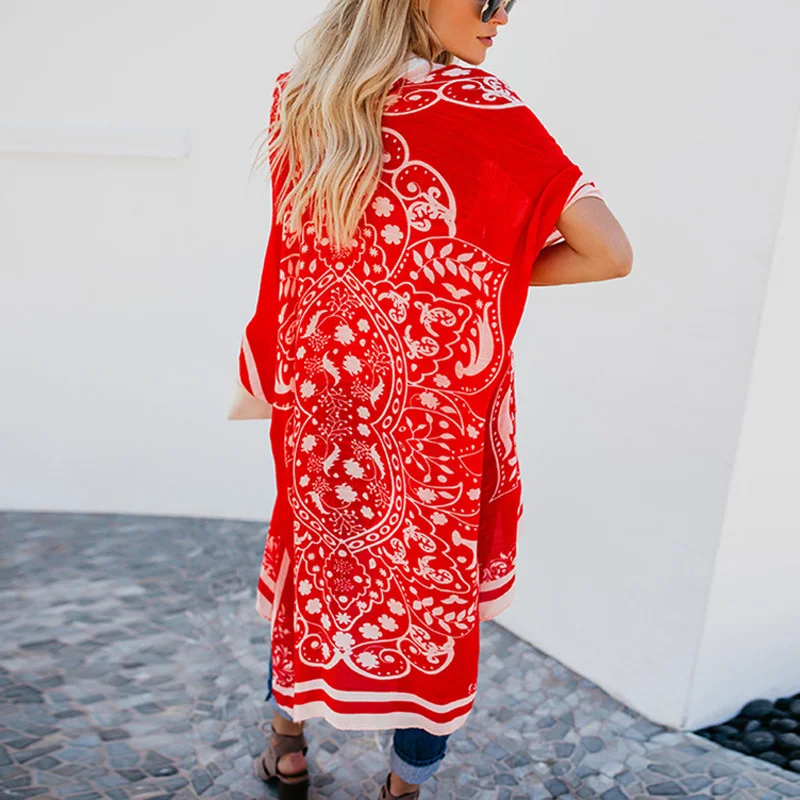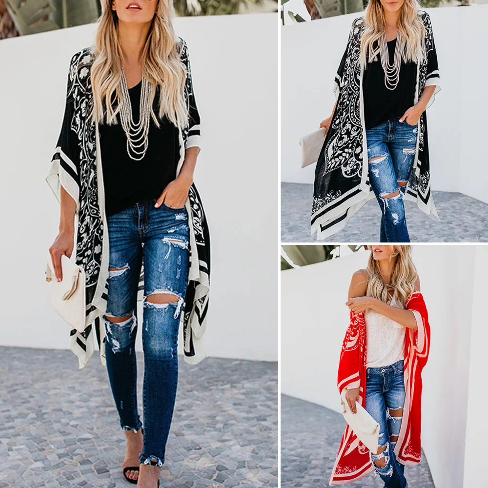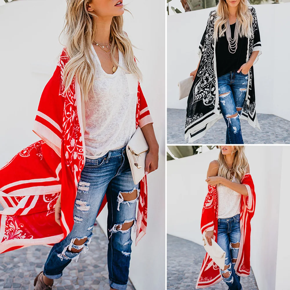 * Описание товара:Женская одежда, летний Ретро комбинезон, шаль пальто, печатный, свободный, рукав летучая мышь, пляжный праздник