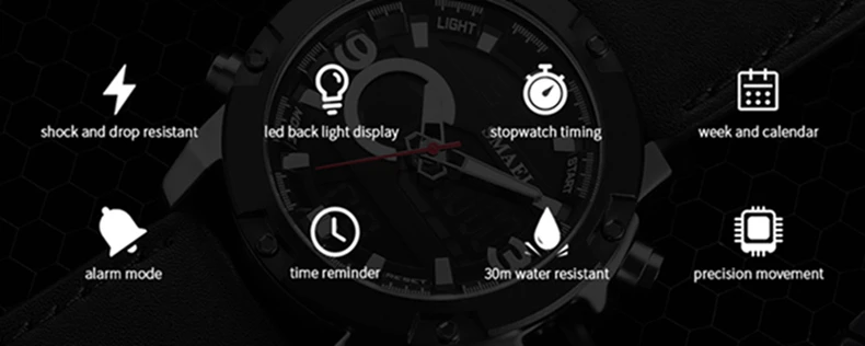 -Особенности: три времени отображения, двойная зона, цифровой дисплей, календарь даты, будильник, водонепроницаемость