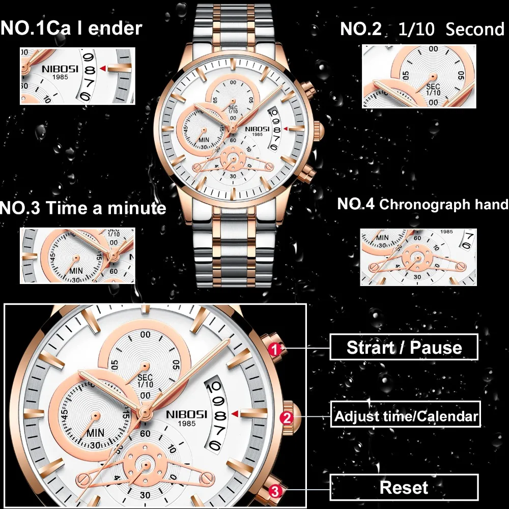 Характеристика: -100% Новое и хорошее качество -Топ бренд класса люкс высокого качества дизайн циферблата -Отображение даты -3 АТМ/30 м водонепроницаемый (повседневный водонепроницаемый дизайн, поддержка мытья рук, мытья лица, мытья автомобиля, дождя) -Светящийся указатель (даже ночью, вы можете легко взять время) -Хронограф -Чехол из сплава (классический эстетический дизайн, роскошный и стильный) -Минеральное стекло (Hardlex и четкое зеркало, устойчивость к царапинам) -Ремешок из нержавеющей стали (удобно носить, роскошно и благородно)