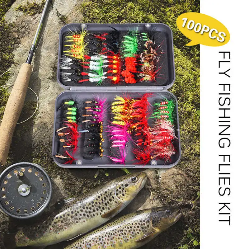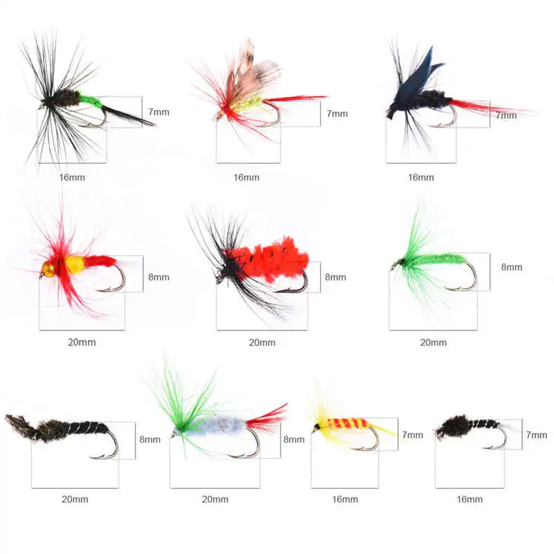 Этот набор мушек для ловли нахлыстом включает в себя разные цвета и крючки для рыбалки в различных условиях.