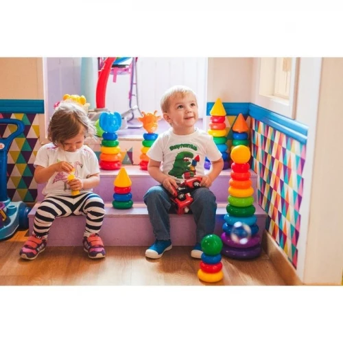 Каждое кольцо разного цвета и пронумеровано. Собирая пирамидку, ребёнок освоит основные цвета радуги и получит базовые навыки счёта. Игры с красочной пирамидкой разовьют у крохи мелкую моторику, координацию движений, воображение, логическое и образное мышление, навыки конструирования. Он научится различать предметы по величине, сравнивать их и делать выводы. Также юный конструктор познакомится с такими понятиями, как «больше», «меньше», «круг», «конус», «плоский», «объёмный».