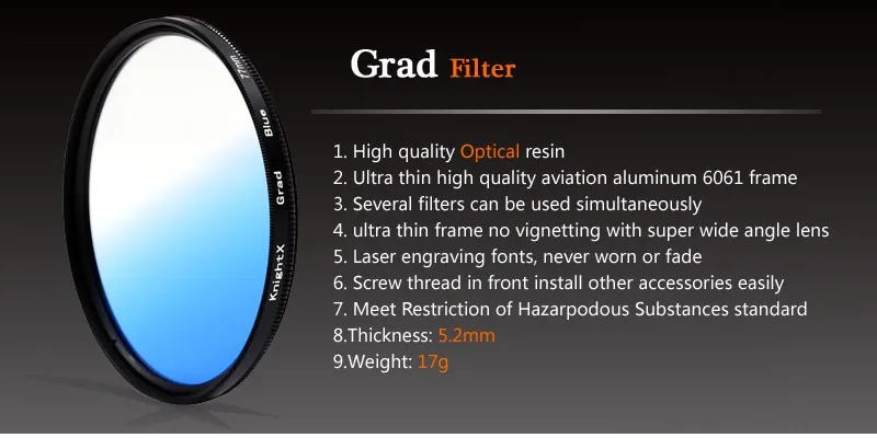 Держатель градиентного фильтраДизайн постепенно уменьшается рядом с центром фильтра, что позволяет делать акцент на переднем плане или фоновом изображении.Цвет линз постепенно исчезает,Таким образом, граница между цветными и прозрачными секциями объектива не станет очевидной даже при остановке диафрагмы объектива.Этот фильтр установлен на вращающейся раме, поэтому вы сможете вращать окраску в любой части вашего изображения.Придавая вашему ландшафту и текстуре кожи более красочное прикосновение.Материал:Оптическая смола