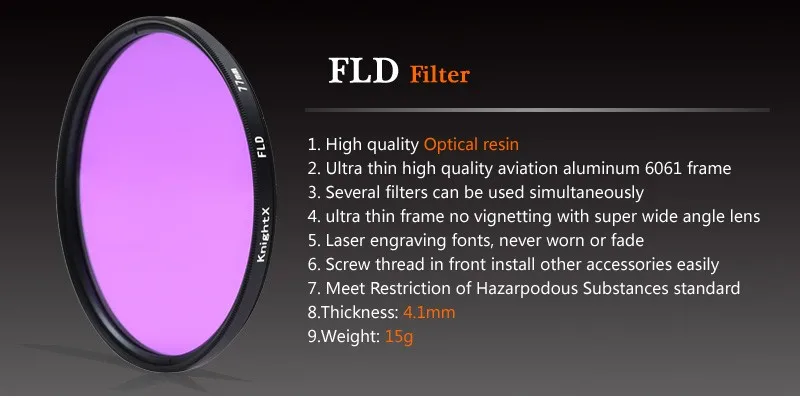 Фильтр fld-фильтрУдаляет жесткое желто-зеленое литье и придает естественный светильник эффект под Флуоресцентный светильникУвеличивает насыщенность цвета предметов при съемке под естественным светильникБыстро поглощает воду на поверхности стекла, фильтров или линз.Материал: OPtical RЕСИН