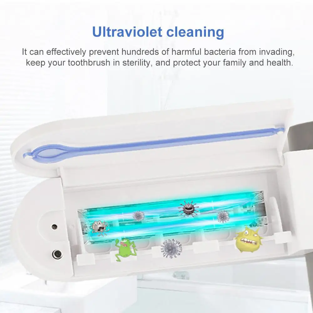 Три в одном, многофункциональный Держатель зубной щетки: семья может вместить до 5 зубных щеток, включая электрическую головку зубной щетки. Дезинфектор зубной щетки: УФ-бомбежит Много суперуф-лучей, особенно убивающих бактерии. УФ-стерилизаторы также противостоят бактериям, которые вызывают плохой запах изо рта и гингивиты.Спесификайтонс: