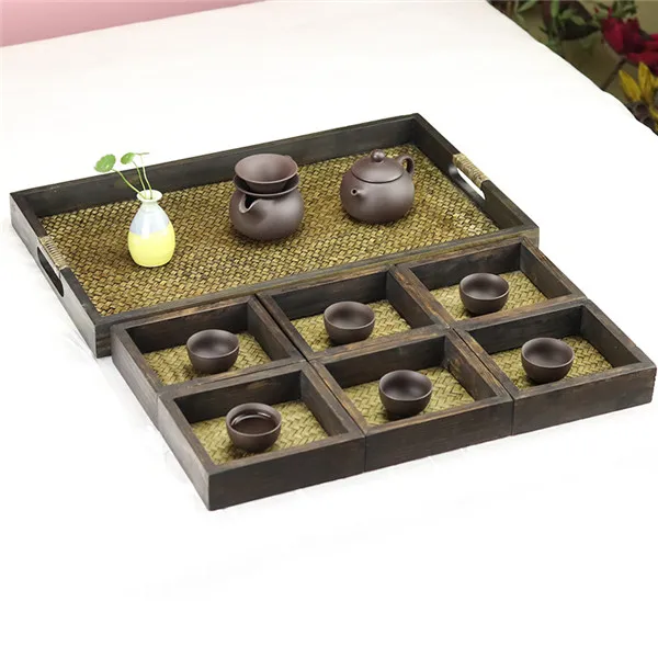 Wood&Rattan Serving Trays with Handle Nesting Multipurpose Trays - for Breakfast, Coffee Table/Butler & Chinese Tea