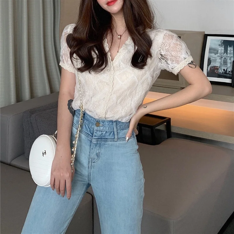 Кружевная сетчатая блузка для женщин, большие размеры, v-образный вырез, Женские топы и блузки, однобортная рубашка, элегантные свободные винтажные рубашки абрикосового цвета
