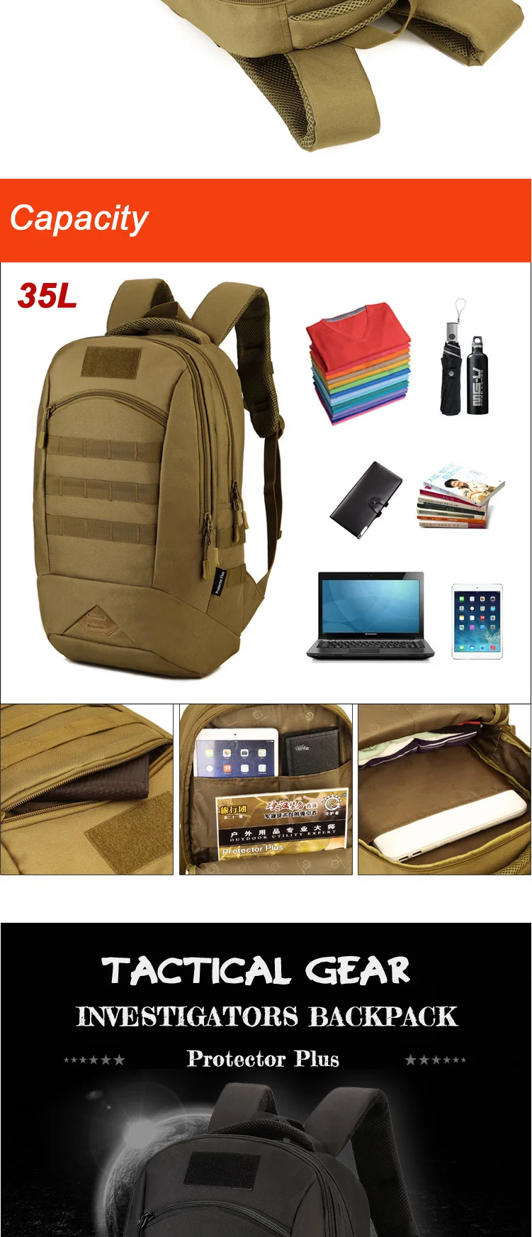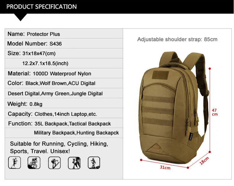 Бренд: PROTECTOR PLUS Название: папосылка для наблюдения 35 л Номер модели: S436 Размеры: 47*31*18 см Материал: противоразрывной нейлон Подкладка: ткань с водонепроницаемым покрытием Вес: 0,8 кг Цвет: CB/BK/ACU/OD/DD/JD Объем: 14-дюймовый ноутбук может быть помещен, и 10 штук футболки. Назначение: рюкзак Подходит для: спорта, кемпинга, походов, скалолазания, унисекс Плечевой ремень можно регулировать до 85 см, ширина 4 см