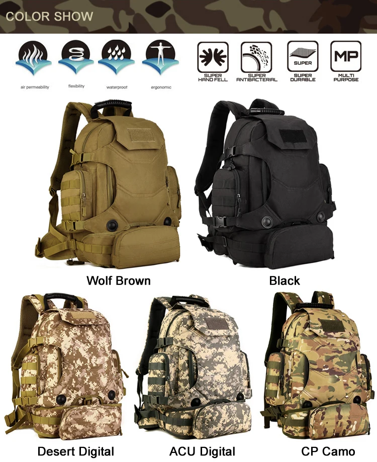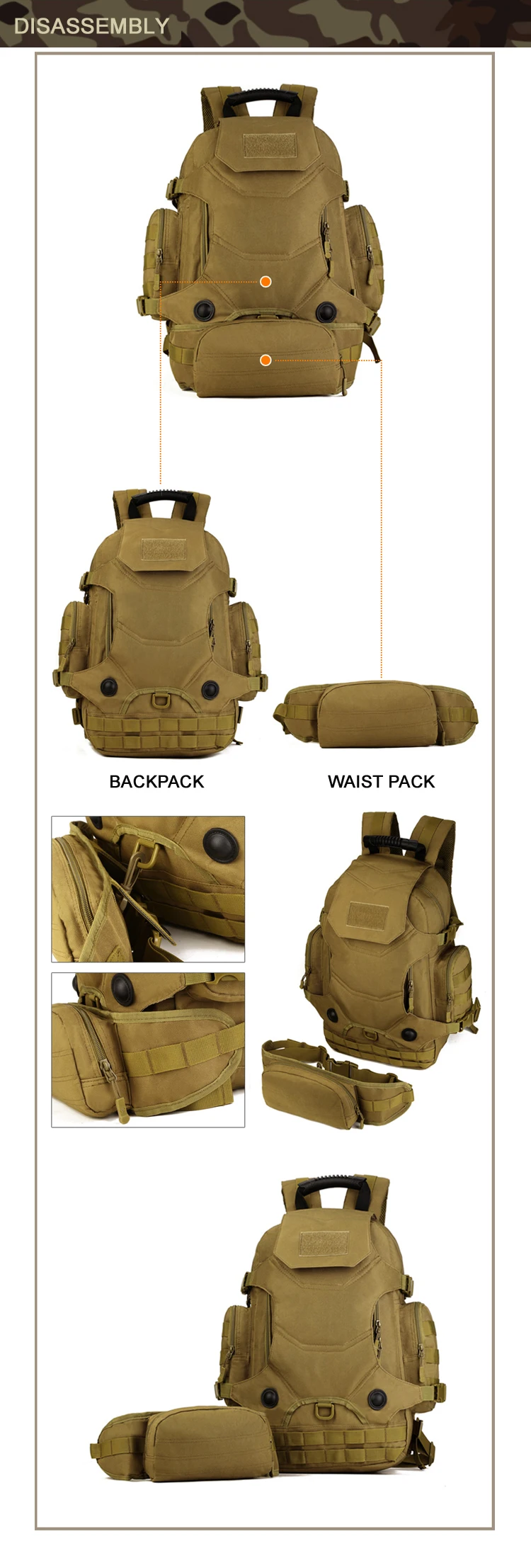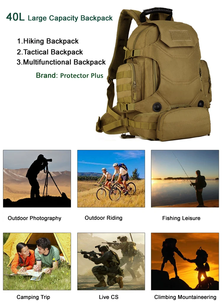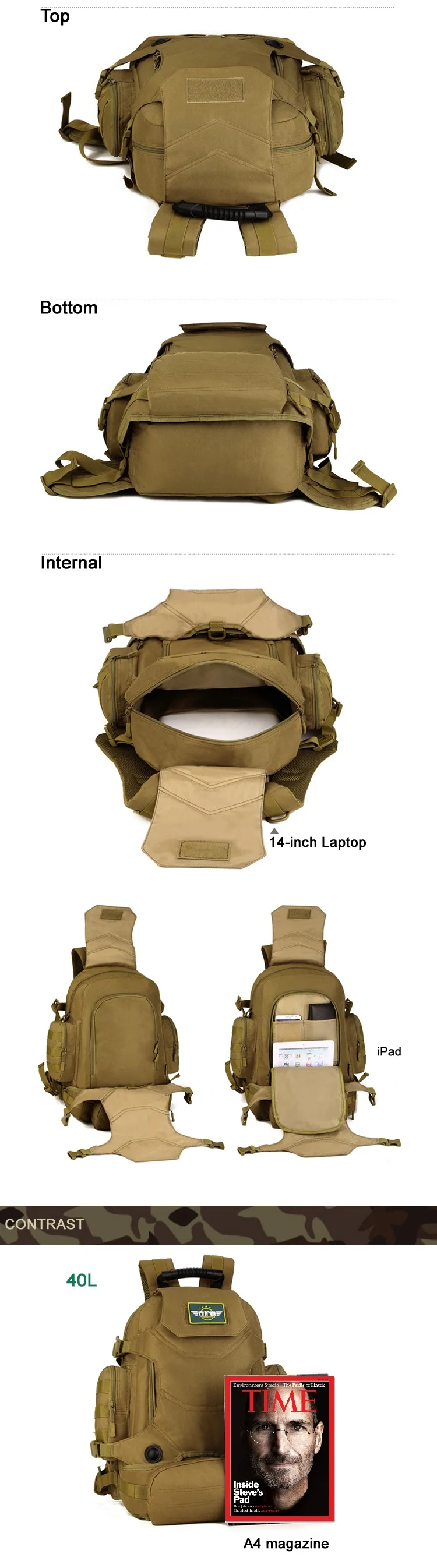 Бренд: Дорожная сумка Наименование: многофункциональный рюкзак объемом 40 л Номер модели: S427 Размер: 46*40*23 см Материал: антиразрывный нейлон Подкладка: ткань с водонепроницаемым покрытием Вес: 1,35 кг Цвет: CB/BK/DD/ACU/CP Функция: рюкзак Плечевой ремень можно регулировать до 92 см, ширина 7 см Пояс может быть отрегулировано до 130 см, ширина 3,5 см и 12 см.
