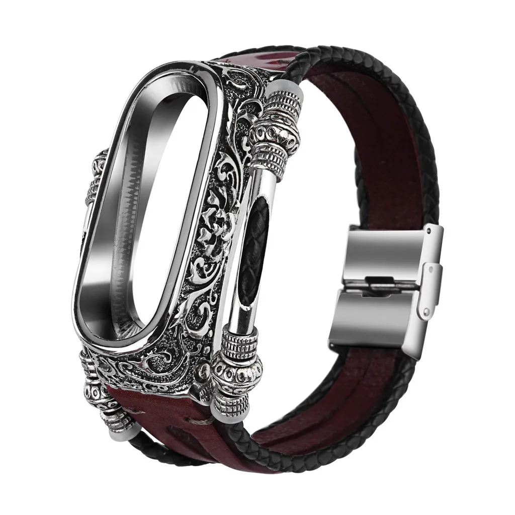 Fashion Retro Men Watch Accessories For Xiaomi Mi Band 4 Replacement Leather Wristband Band Strap+ Metal Case High-end Gifts