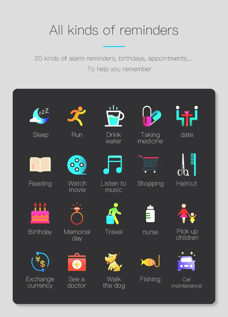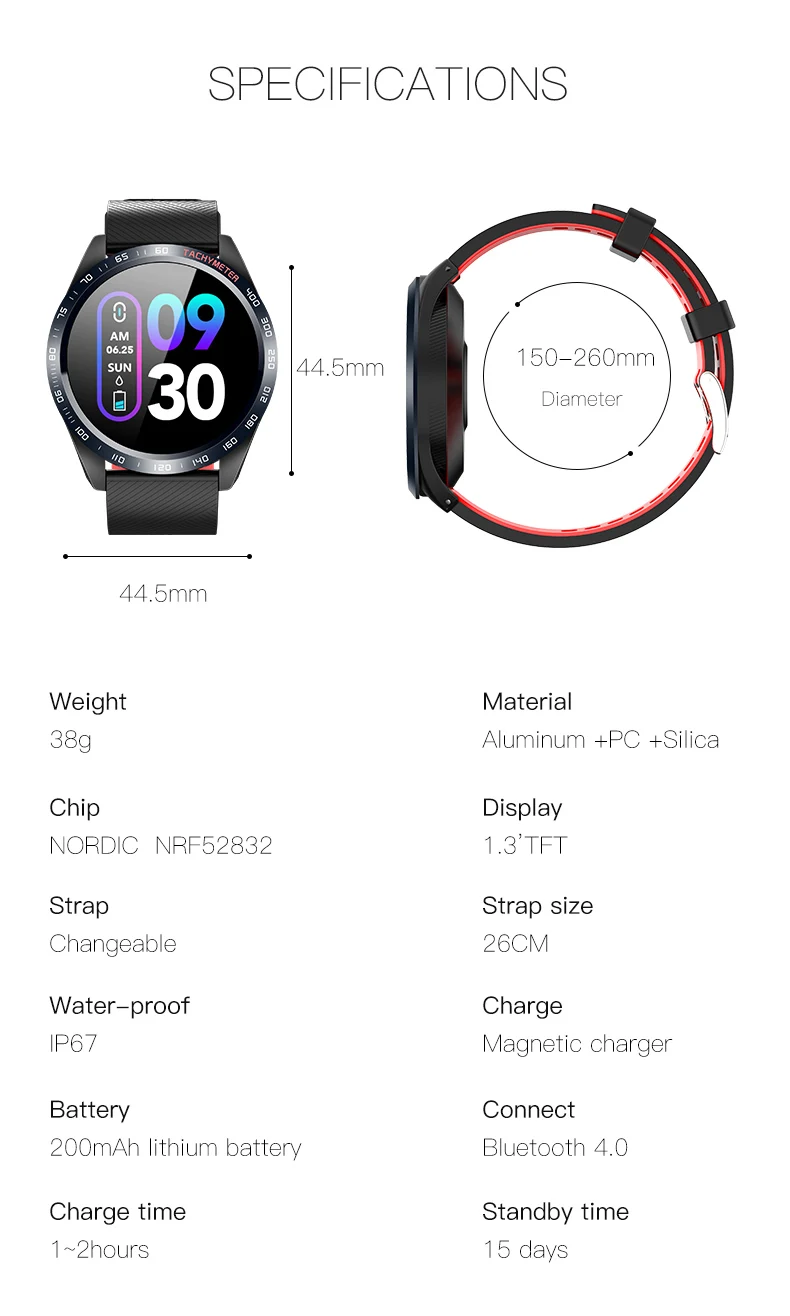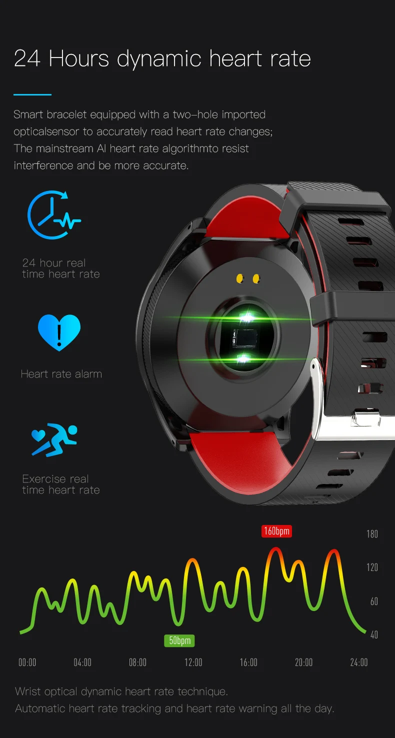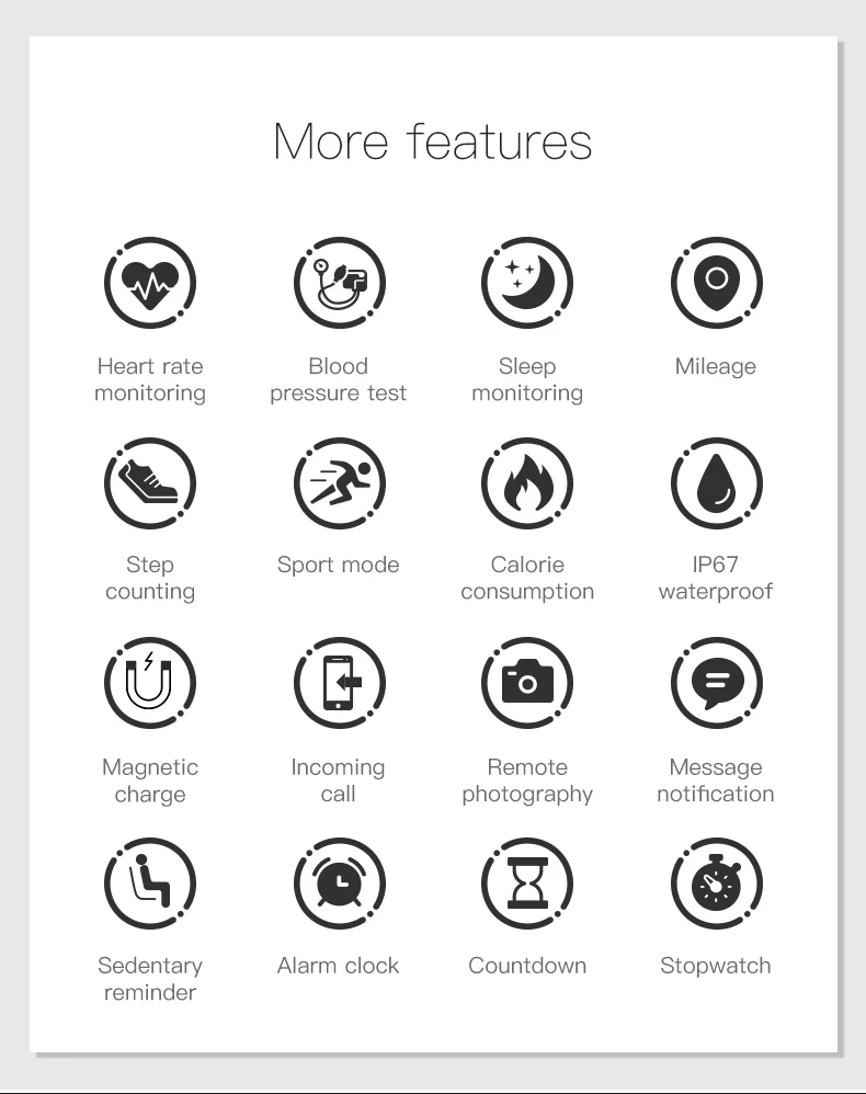 Параметры: Функции: пульс; Кровяное давление; Кислород; Мониторинг сна; Водонепроницаемость; Упражнения WeChat; Умный будильник; Секундомер; Обратный отсчет; Длительное сидение; Сообщение; Режим ожидания в течение 7 дней; найти браслет; Шаг подсчета движения; Расстояние движения; Калории; WeChat ; QQ; Микро-блог Напоминания: имя входящего вызова Поддержка уведомлений: Wechat QQ Facebook Twitter WhatsApp Skype Instagram и так далее Дисплей: на тонкопленочных транзисторах на тонкоплёночных транзисторах Экран Размеры: 1,3 дюймов TFT HD одним нажатием кнопки управления Дисплей Интерактивный режим: одно касание Аппаратная платформа: скандинавский N52832 Bluetooth: Bluetooth LE 4,0 Требования к Android: Android 4,4 выше Требования iOS: iOS 8,0 выше 24 часа в сутки сердечного ритма Шагомер: пройденное расстояние и сожженные калории Монитор сна: обеспечивает время сна и качество сна Водонепроницаемость IP67: Водонепроницаемость. Не поддерживает плавание и душ Цвет: черный, зеленый, красный, серый, синий Язык поддержки приложения: английский, японский, корейский, немецкий, испанский, французский, русский, португальский, китайский, Посылка включает в себя: 1 умный Браслет (с розничной коробкой) Руководство пользователя-1 шт.; 1 x Зарядное устройство