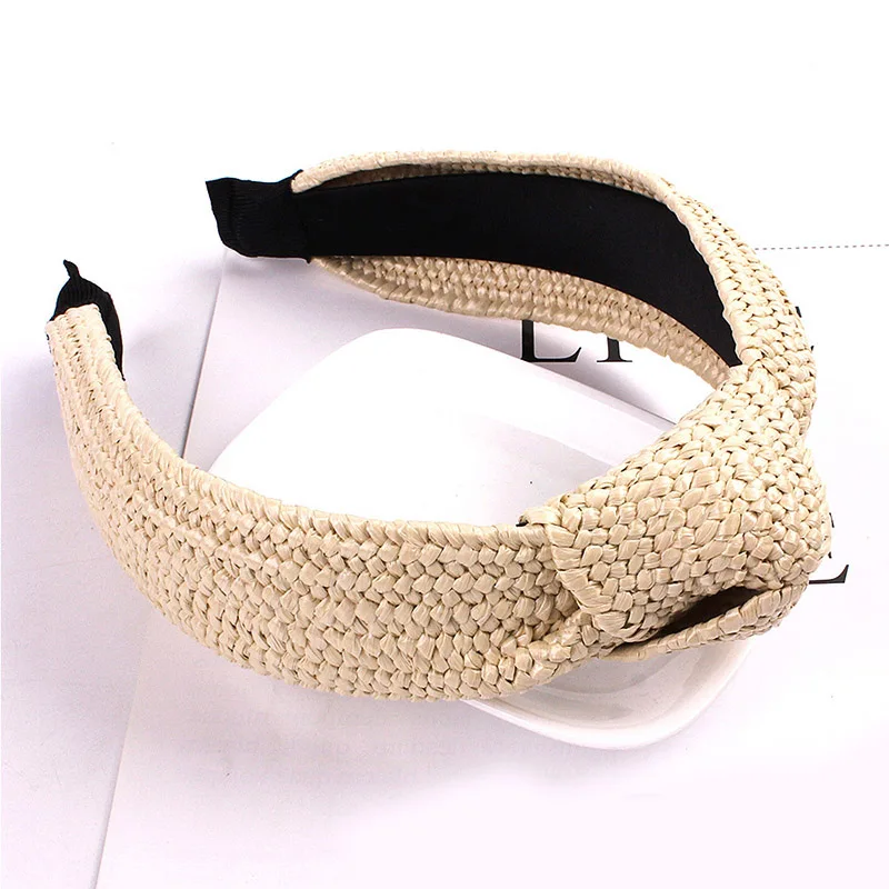 Women Handmade Weaving Straw Cross Knotted Headband Bohemian Wide Hair Band Hoop