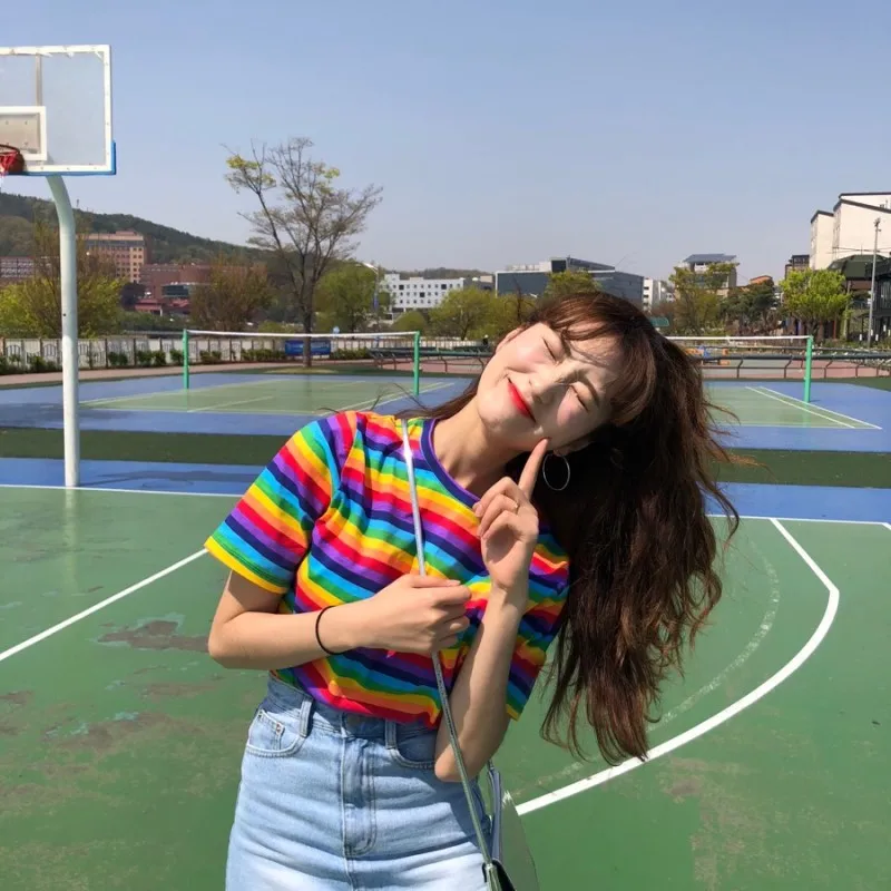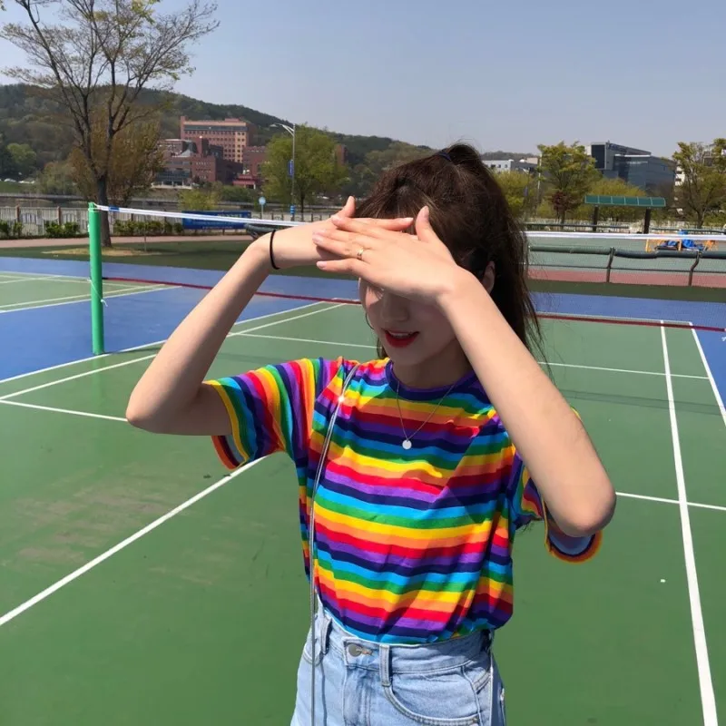 Женские футболки в радужную полоску, большие размеры, корейские летние рубашки с коротким рукавом, свободные футболки с круглым вырезом, футболки Harajuku, Kawaii, одежда