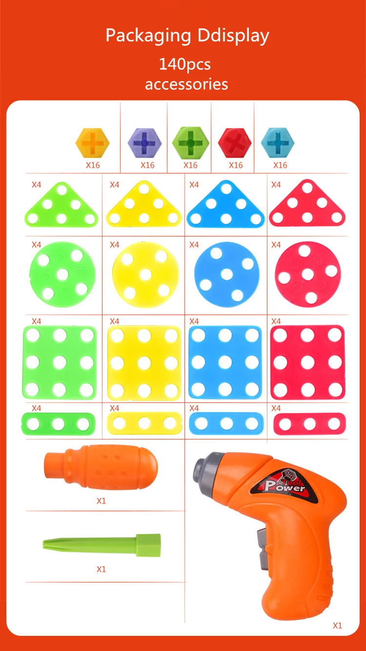 Product:Rectangular suitcase three-dimensional puzzle with electric drill Pegboard Size: 24 * 30 * 6cm Made of green environmental material, no harm to your kids Children can drill colorful screws into the board to make tons of cool designs. Note:2 X AA batteries (not included) This great value pack comes with enough pieces and in enough colors so your child will be entertained for a long time. They will love playing with the different colored pieces and creating their own designs!