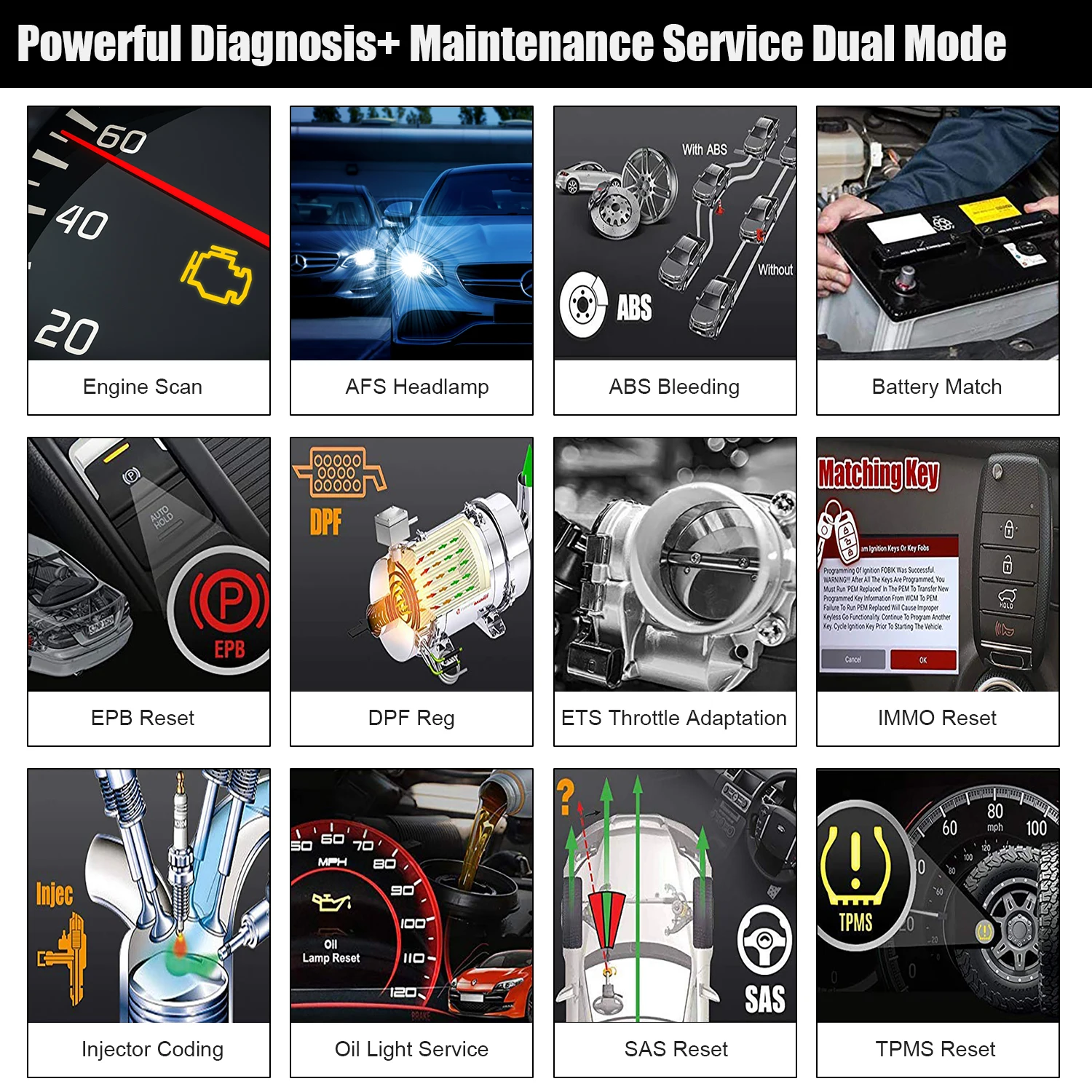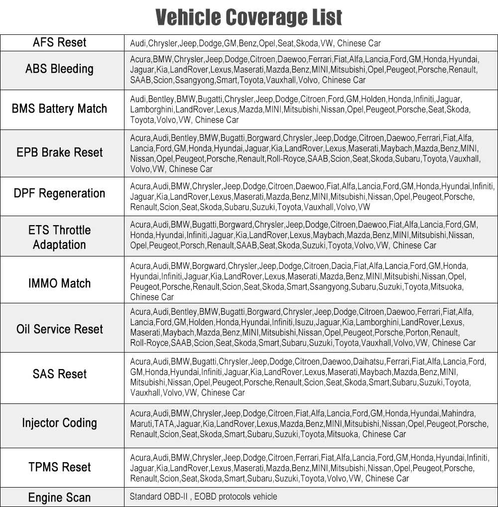 1. Служба сброса масляной лампы: Позволяет выполнить сброс для нового подсчета срока службы моторного масла после изменения масла. 2.EPB сервис: Это важно для поддержания безопасности и эффективности электронной тормозной системы. 3. Обслуживание батареи летучей мыши: Позволяет инструменту сканирования оценить состояние заряда батареи, контролировать ток замыкания, зарегистрировать замену батареи и активировать состояние остальной части транспортного средства. 4. Служба DPF: Специально работает для дизельной системы Сажевых фильтров с регенерацией DPF, замена компонентов DPF teach-in и DPF teach-in после замены блока управления двигателем. 5. Обслуживание SAS: Помогает очистить память датчика угла поворота руля и играет важную роль в калибровке датчика угла поворота руля. 6. Услуги TPMS: Имеет значение в отображении идентификационных кодов датчиков от ЭБУ транспортного средства, вводе идентификационных кодов замены датчика TPMS и тестовых датчиков. 7. Программирование ключей IMMO: Уникальное Программирование автомобильных ключей и функция считывания ПИН-кода, он в основном используется для отключения ключей от утерянного автомобиля и программирует Новый Сменный брелок для ключей. 8.ABS кровотечение: ABS тормозное кровотечение для получения твердой тормозной колодки после изнеможения воздуха после ремонта ABS насосной системы 9. Сброс фар AFS «AFS» означает адаптивную систему переднего освещения (ночью с биксеноновыми фарами), которая вращается с любой стороны, нажимая на эту кнопку, означает, что они остаются направленными прямо вперед и не поворачиваются при повороте рулевого колеса 10. Кодирование инжектора Протекающие инжекторы и некоторые мертвые инжекторы могут быть пропущены, даже если инжектор отключен. Другие проблемы с системой зажигания и механическими компонентами также могут не показать потерю оборотов при выключенном инжекторе 11. Адаптация дроссельной заслонки Корпус дроссельной заслонки представляет собой трубу с поворотным плоским клапаном (бабочкой), который используется для контроля количества воздуха, входящего в двигатель. В автомобиле с электронным впрыском топлива Датчик положения дроссельной заслонки и датчик воздушного потока связываются с компьютером, который поставляет необходимое количество топлива на инжекторах. Необходимо переосваивать Положение датчика дроссельной заслонки после очистки или ремонта