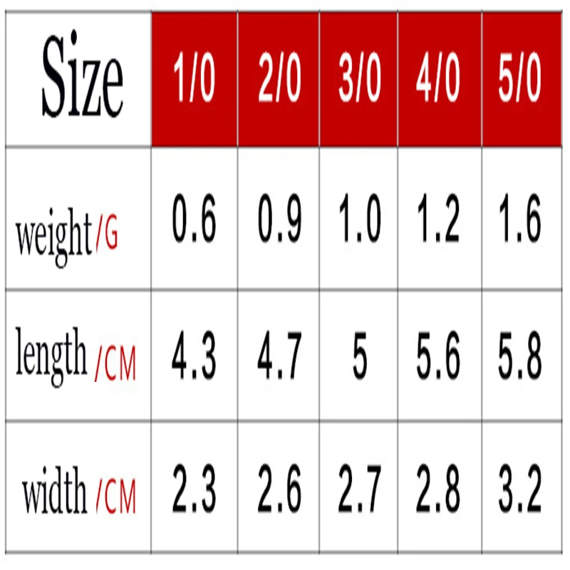 Quantity:1/0# =10pcs 2/0#=10pcs 3/0#=10pcs 4/0#=10pcs 5/0#=10pcs Total 1set=50pcs (each size 10pcs )