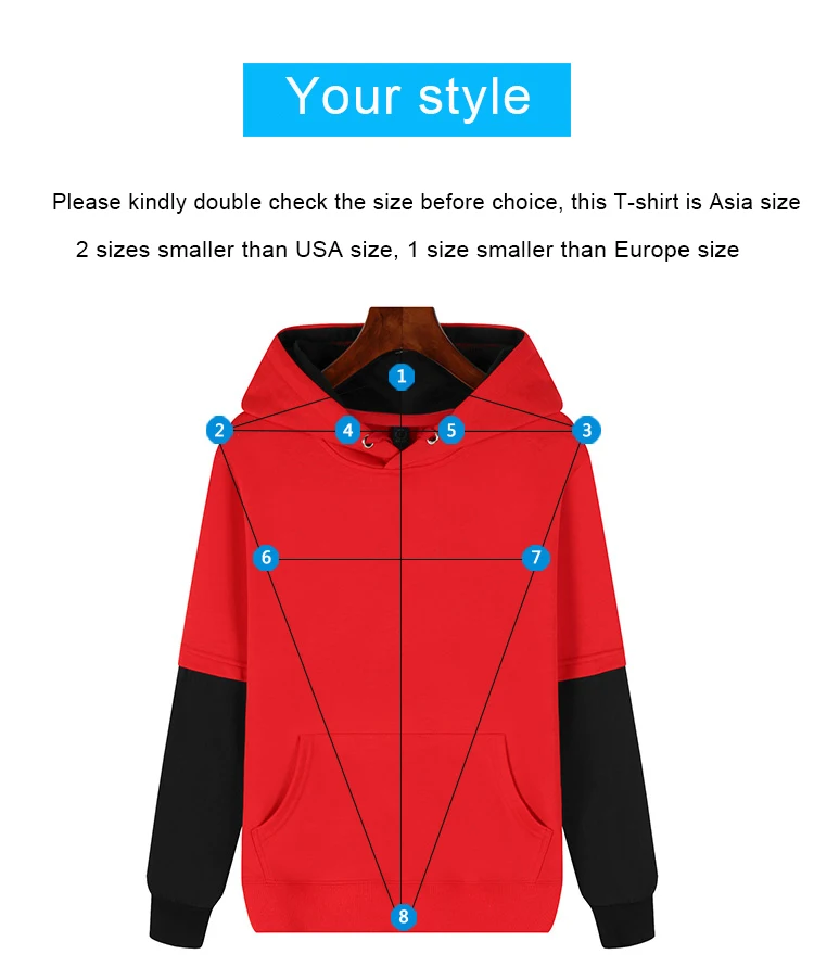 Пожалуйста, обратите внимание: 1. Пожалуйста, дважды проверьте размер перед выбором, это толстовки азиатского размера, на 2 размера меньше, чем размер США, на 1 размер меньше, чем европейский размер 2, вы можете настроить свой собственный логотип, который можно настроить вышивкой или напечатанным брендом DIY. Пожалуйста, свяжитесь с нами, прежде чем вам нужно ваше лого на заказ. Логотип не является бесплатным. Но если количество одежды превышает 10, то плата за логотип спереди бесплатна. 3, цвет изделия, отображаемый на фотографиях, может немного отличаться от цвета на вашем компьютере, так как мониторы не калибруются так же.