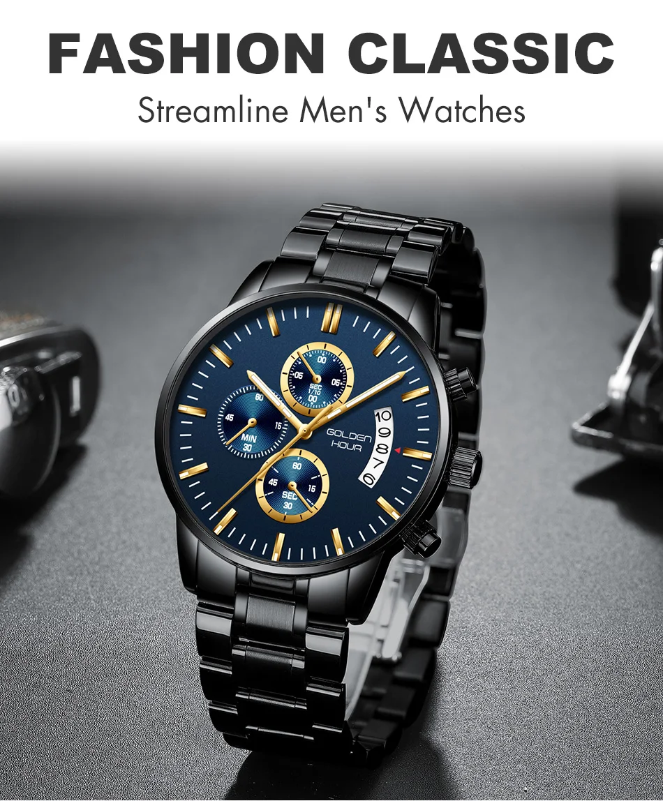 GOLDENHOUR Watch Top Brand Fashion Stainless Steel Sport Men Watches Mens Luxury Business Waterproof Quartz Wristwatch Relogio Masculino