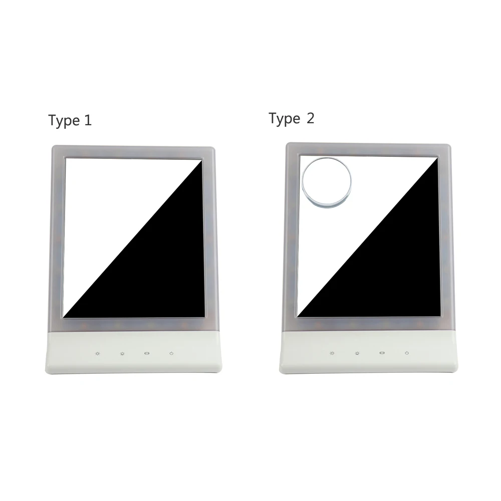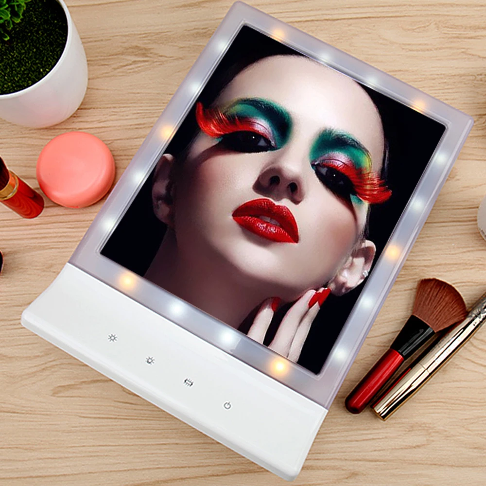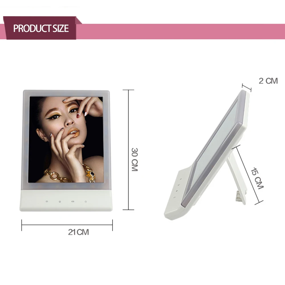 This is a LED makeup mirror, which is extremely helpful for women and girls in applying makeup. With it there is no need to worry that you will have a flawed makeup application due to dim light. As for the power supply of the mirror, it can be powered by battery as well as powered by the USB connection. If you still have concerns about no place for the mirror to stand, you can also rest assured, for the mirror can be hung on the wall with a hole for hanging on its back.