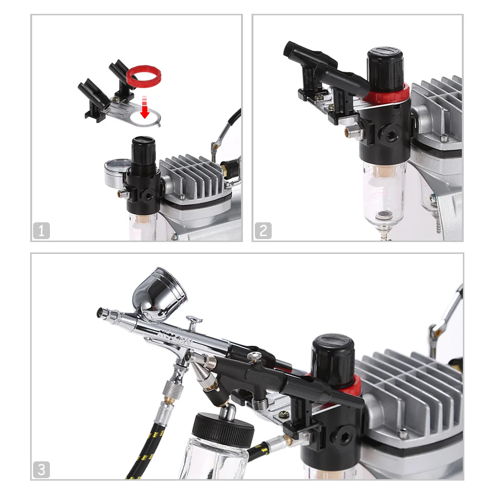Great Performance Airbrush Compressor with air pressure gauge, air filter, adjustable pressure, cleaning brushes and airbrush holder for 2 airbrushes.