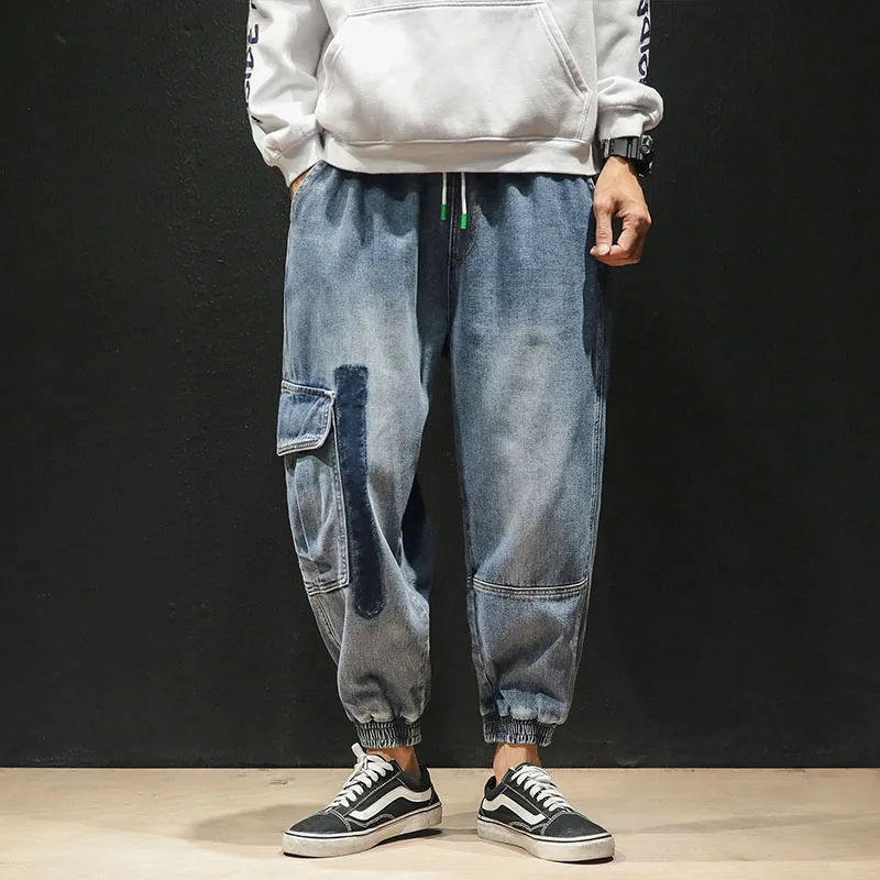 Модные синие джинсы в стиле ретро, мужские шаровары в стиле Харадзюку, Свободные повседневные брюки с прострочкой, потертые черные джинсы, прямые брюки с карманами