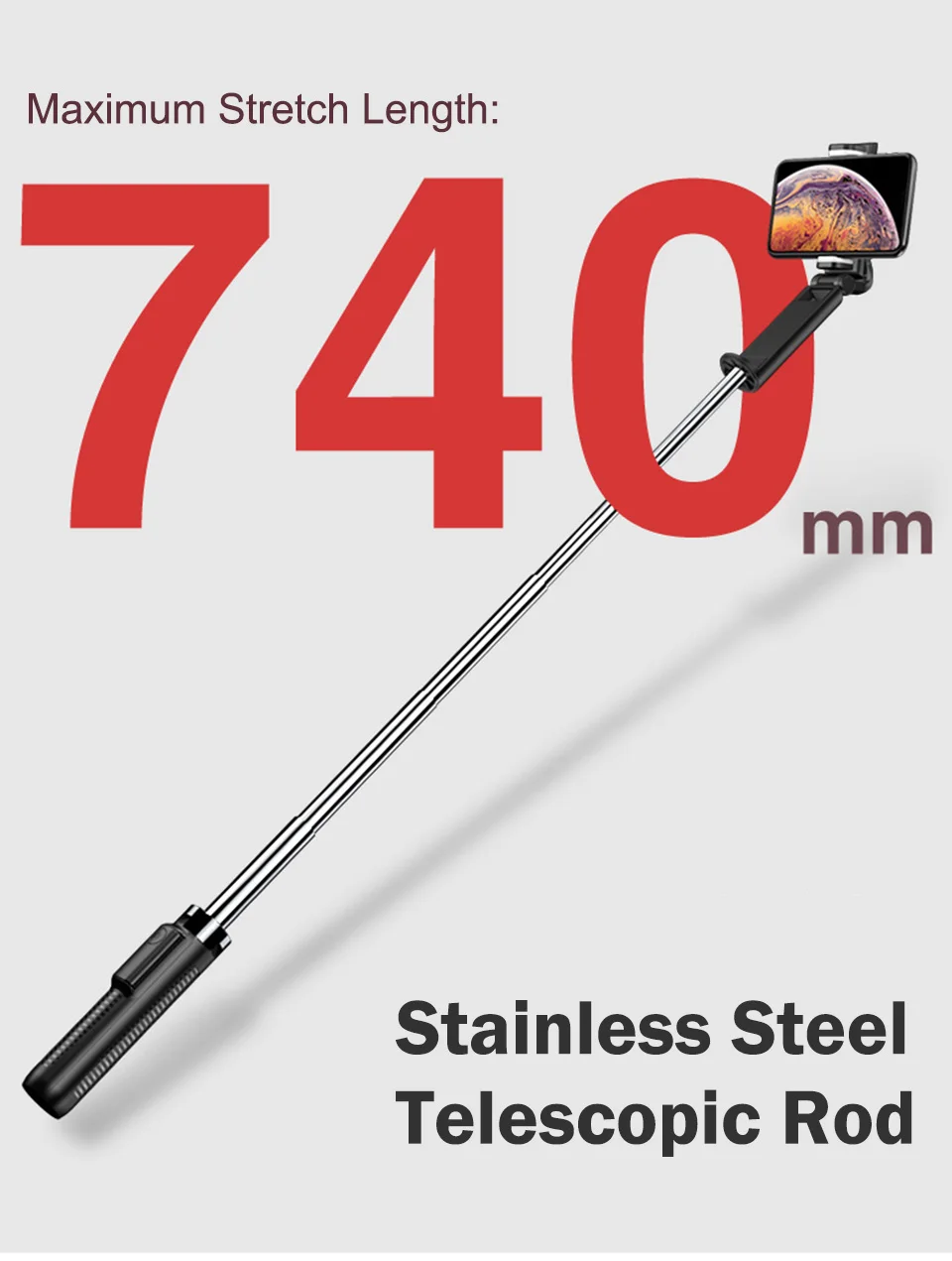 Product parameters: Product Name: Transformers Bluetooth Selfie Stick Type:Tripod bracket Material: ABS + silicone + stainless steel Bluetooth: 3.0 Bluetooth range: 10M Battery model: CR1632 Shrinkage length: 210mm Stretch length: 740mm Main material: stainless steel / ABS Software support: Android Photo mode: horizontal, vertical, built-in tripod Size: 36mmx210mm Usage:watch movie/group photo 360 degree rotation, take multiple photos