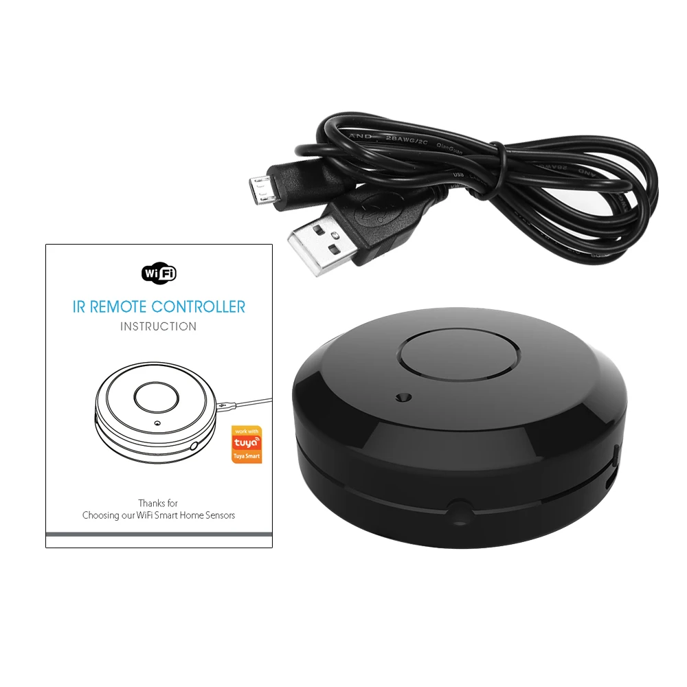 Параметры Источник питания: USB 5 В/1 А Инфракрасное расстояние: 7 м Инфракрасный угол: 360 градусов Максимальный ток: 0,55 W Беспроводной Тип: 2,4 ГГц Беспроводная Stardard : IEEE 802.11b/g/n Диапазон беспроводной связи: 45 м Рабочая температура: 0-40 градусов Рабочая влажность: 20-85% Температура хранения: 0-60 градусов Влажность хранения: 0-90% Размер: 69*69*34 мм Название приложения: Tuya Smart/Smart Life Поддержка: Amazon Alexa и Google Assistant iFTTT В комплекте: Универсальный ИК-пульт дистанционного управления × 1 Кабель питания × 1 Ручной × 1 шт.