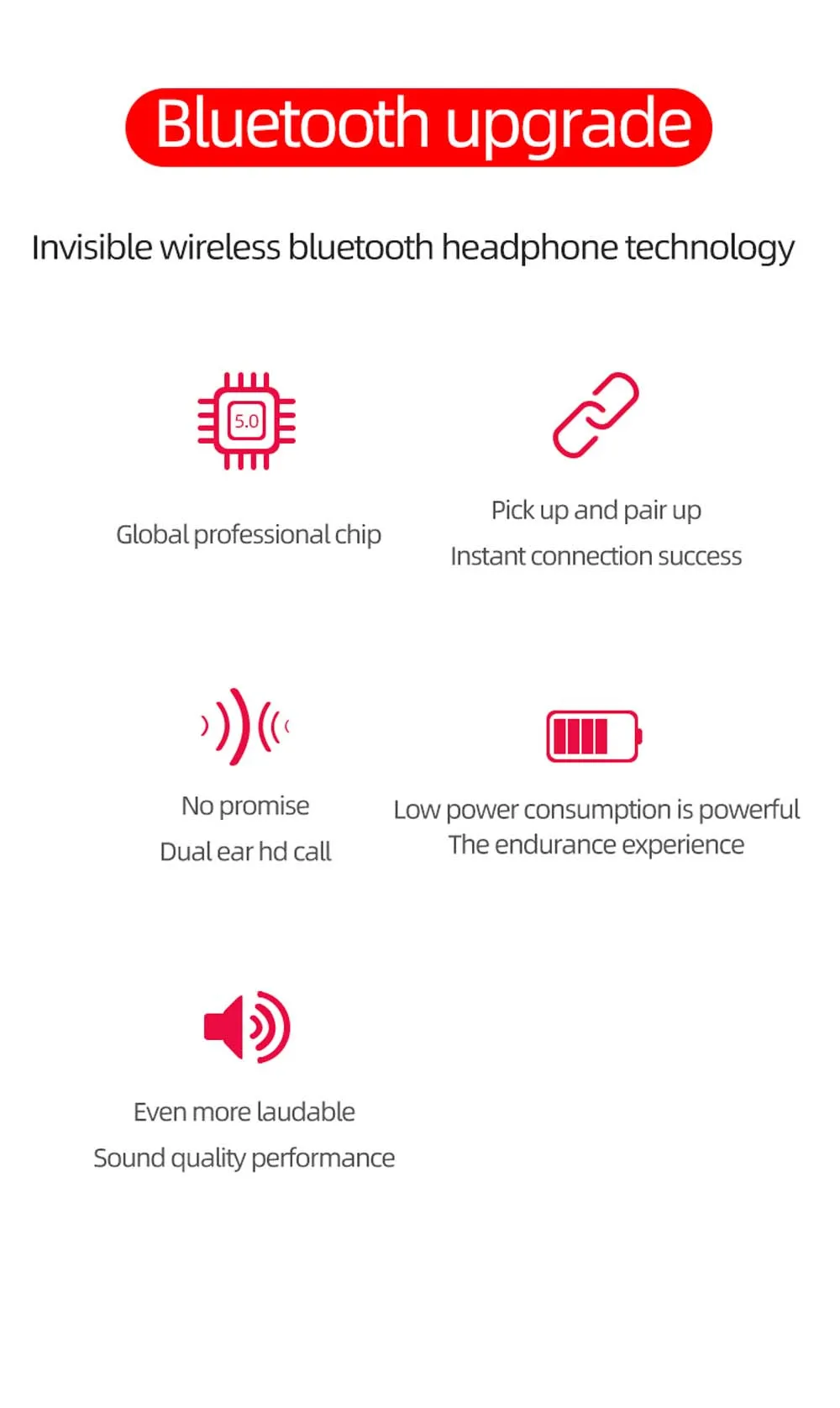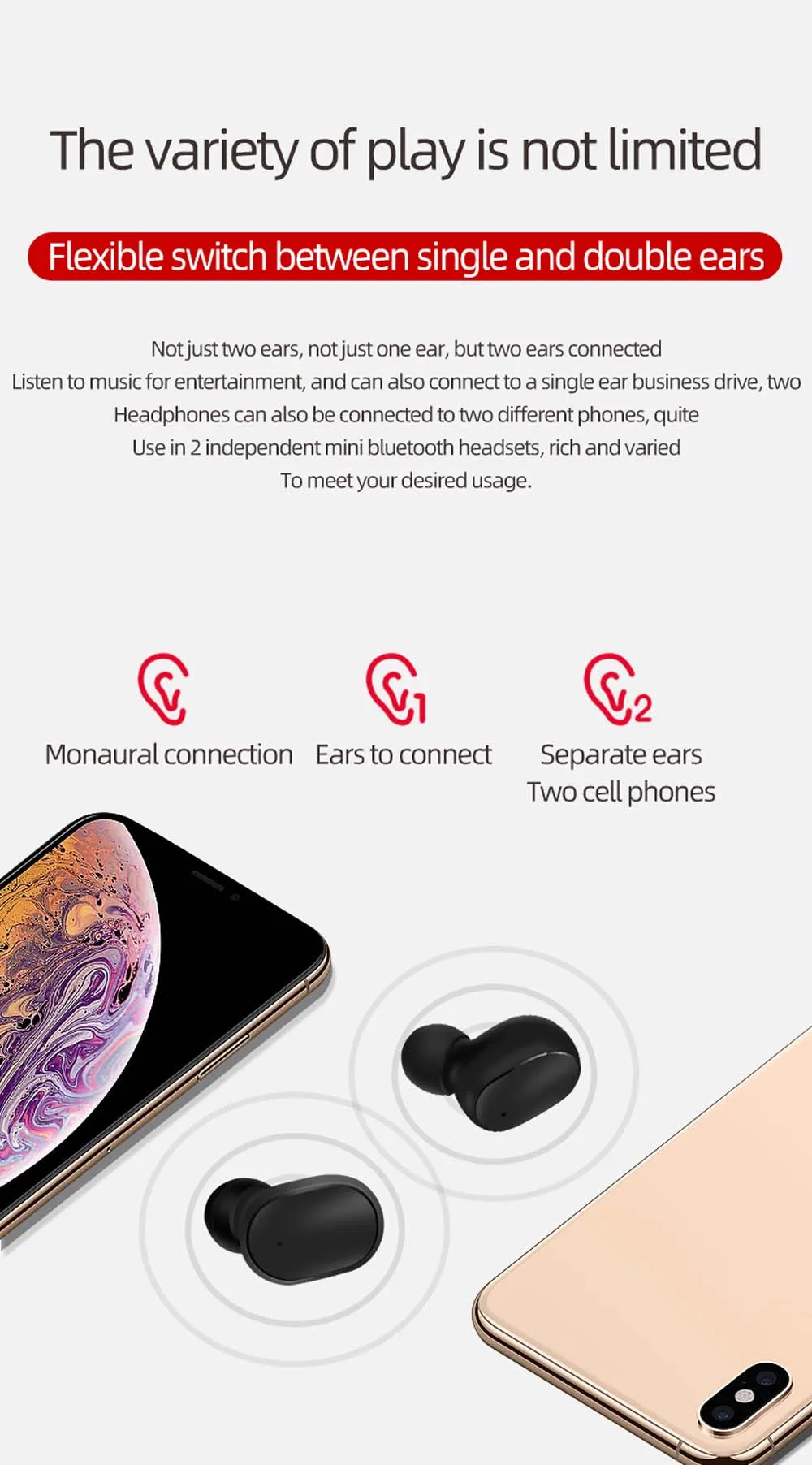 Описание: Тип изделия: наушники Bluetooth Одна кнопка управления легко включается/выключается, воспроизводит/паузы/переключает музыку, свободные руки звонки для вождения, работы, встречи, бега. Одно-два подключения, можно подключить к двум мобильным телефонам одновременно. Интеллектуальная Совместимость: Поддержка всех Bluetooth мобильный телефон, планшет, ноутбук, QQ музыка, фильмы и т. Д., универсальный мобильный телефон. Характеристики: 1. Версия Bluetooth: V5.0 2. Расстояние Bluetooth: 10 м 3. Время зарядки: около 1-2 часов 4. Время работы в режиме ожидания: около 80 часов 5. Время воспроизведения музыки: около 3 часов 6. Время разговора: около 4 часов 7. Аккумулятор для наушников: полимерный литиевый аккумулятор 45 мАч 8. Аккумулятор: полимерный литиевый аккумулятор 280 мАч 9. Формат передачи аудио: HFP/A2DP/HSP/AVRCP Посылка включает в себя: 1 x Мини TWS Bluetooth наушники (левый и правый уши) 1 x Зарядное устройство 280 мАч