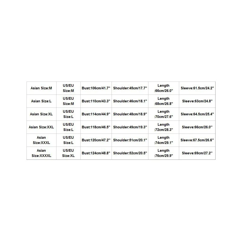 Азиатский Размеры US/EU Размеры Обхват груди Сумка на плечо Длина Рукава М М 106 см/41,7" 45 см/17,7" 66 см/26,0" 61,5 см/24,2" L М 110 см/43,3" 46 см/18,1" 68 см/26,8" 63 см/24,8" XL L 114 см/44,9" 48 см/18,9" 70 см/27,6" 64,5 см/25,4" XXL L 118 см/46,5" 49 см/19,3" 72 см/28,3" 66 см/26,0'' XХХL L 120 см/47,2'' 51 см/20,1" 74 см/29,1" 67,5 см/26,6'' XXXXL XL 124 см/48,8" 52 см/20,5" 76 см/29,9" 69 см/27,2''