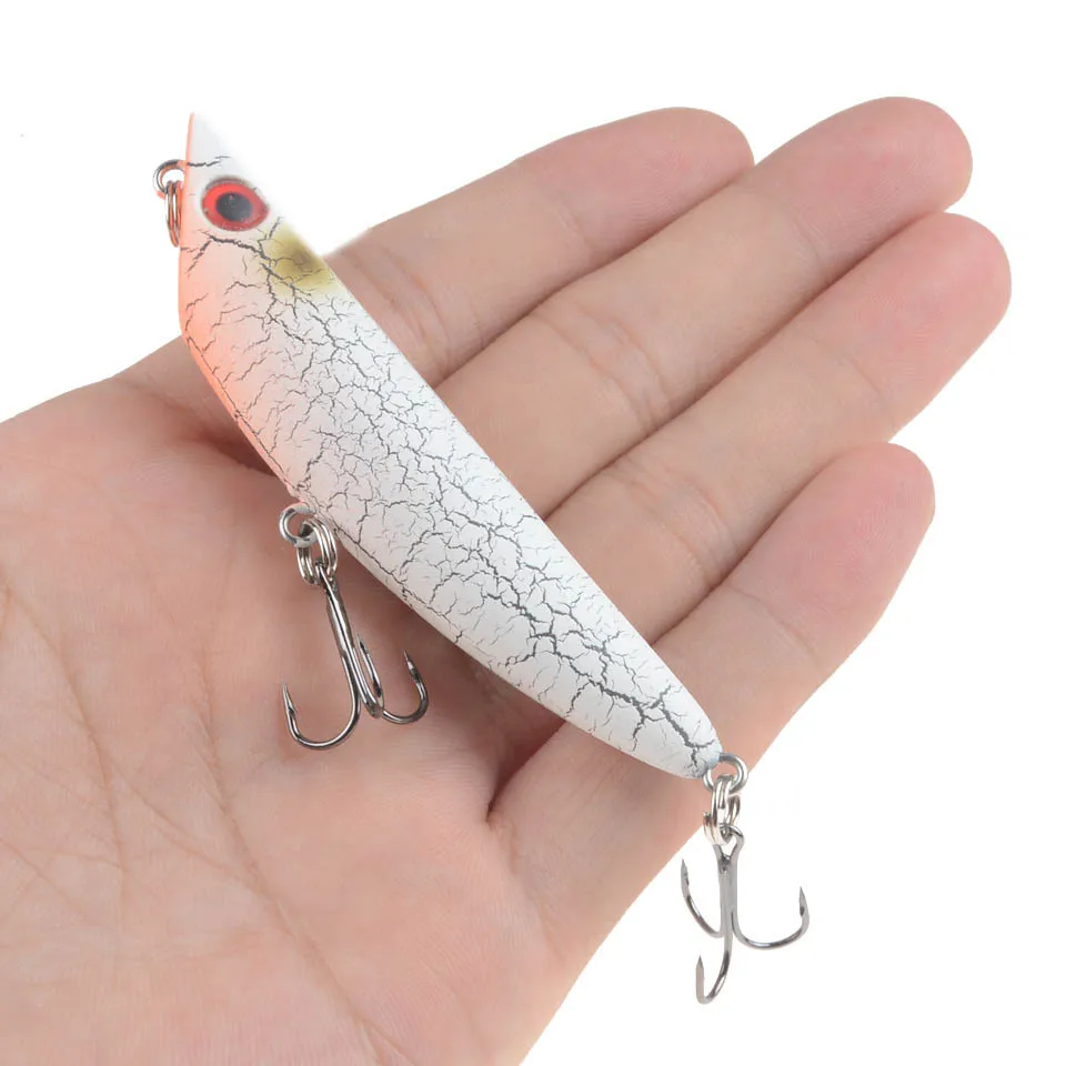 Длина: 8 см Вес: 8,5 г Тип: плавающая вода Крючки: 6 # заостренный растянутый крючок Подходит для морской и пресной рыбалки: окунь Наклонный рот, черная рыба, сома, зеленая рыба, китайский окунь, травяной Карп и т. Д.