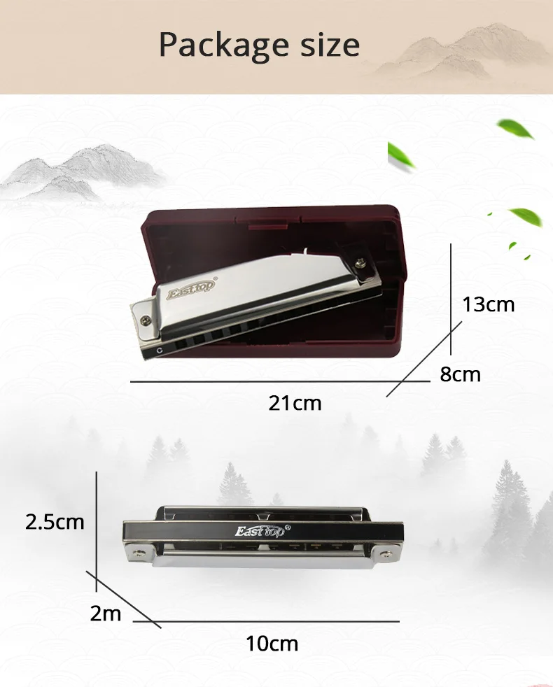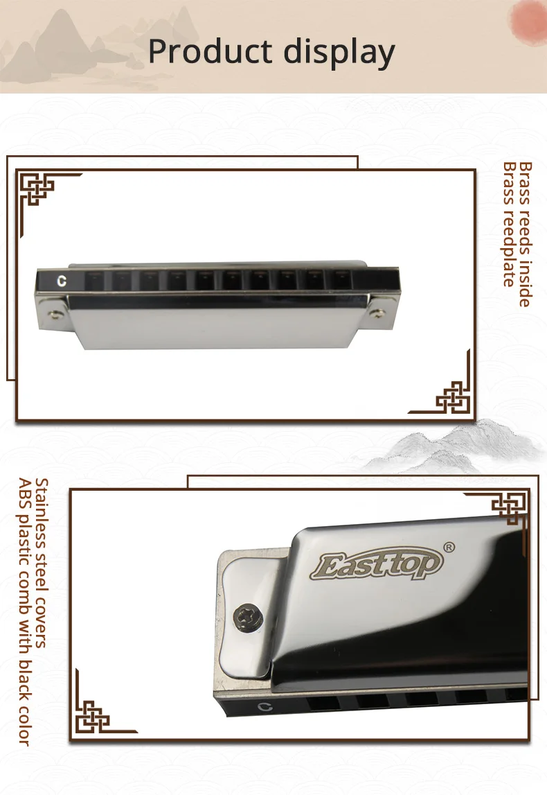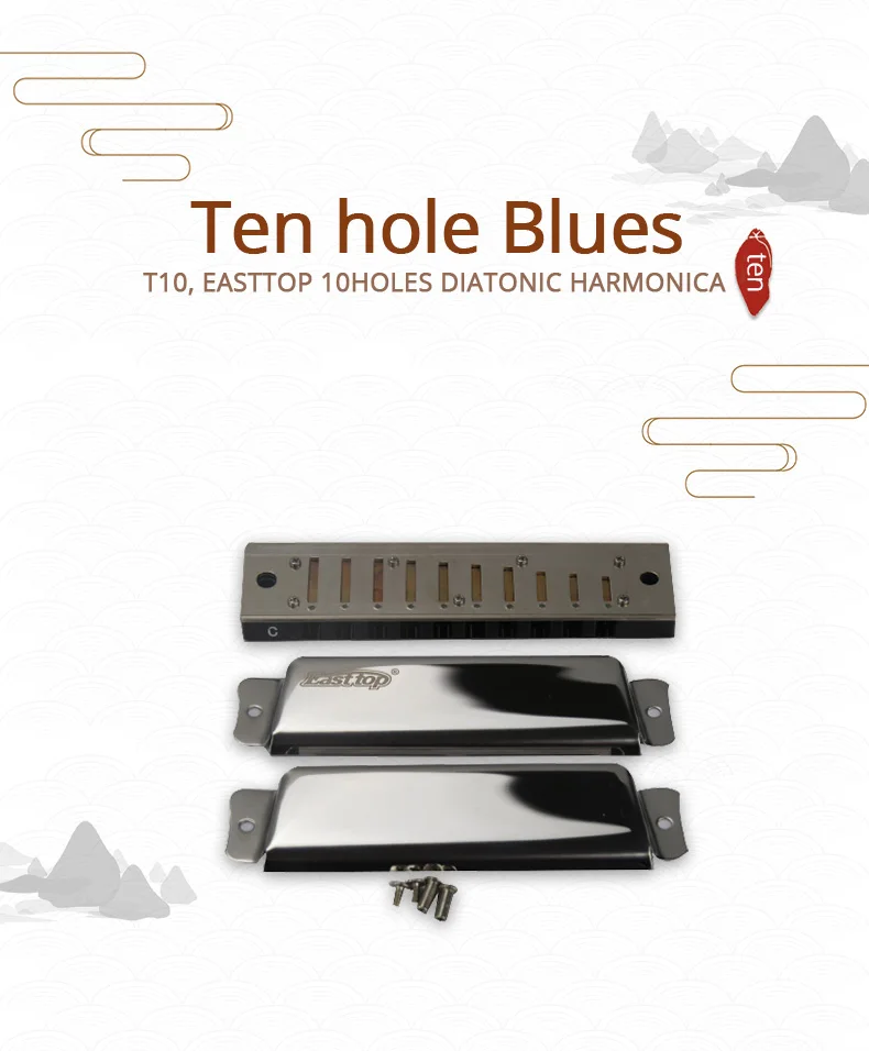 Товар № T10 EASTTOP 10 отверстий диатоническая Губная гармошка с ключом C Рекламная гармошка с хорошей ценой и хорошим звуком. Латунные трости внутри Латунная пластина Крышки из нержавеющей стали ABS пластиковая расческа черного цвета. Бренд: EASTTOP Лазерный логотип.