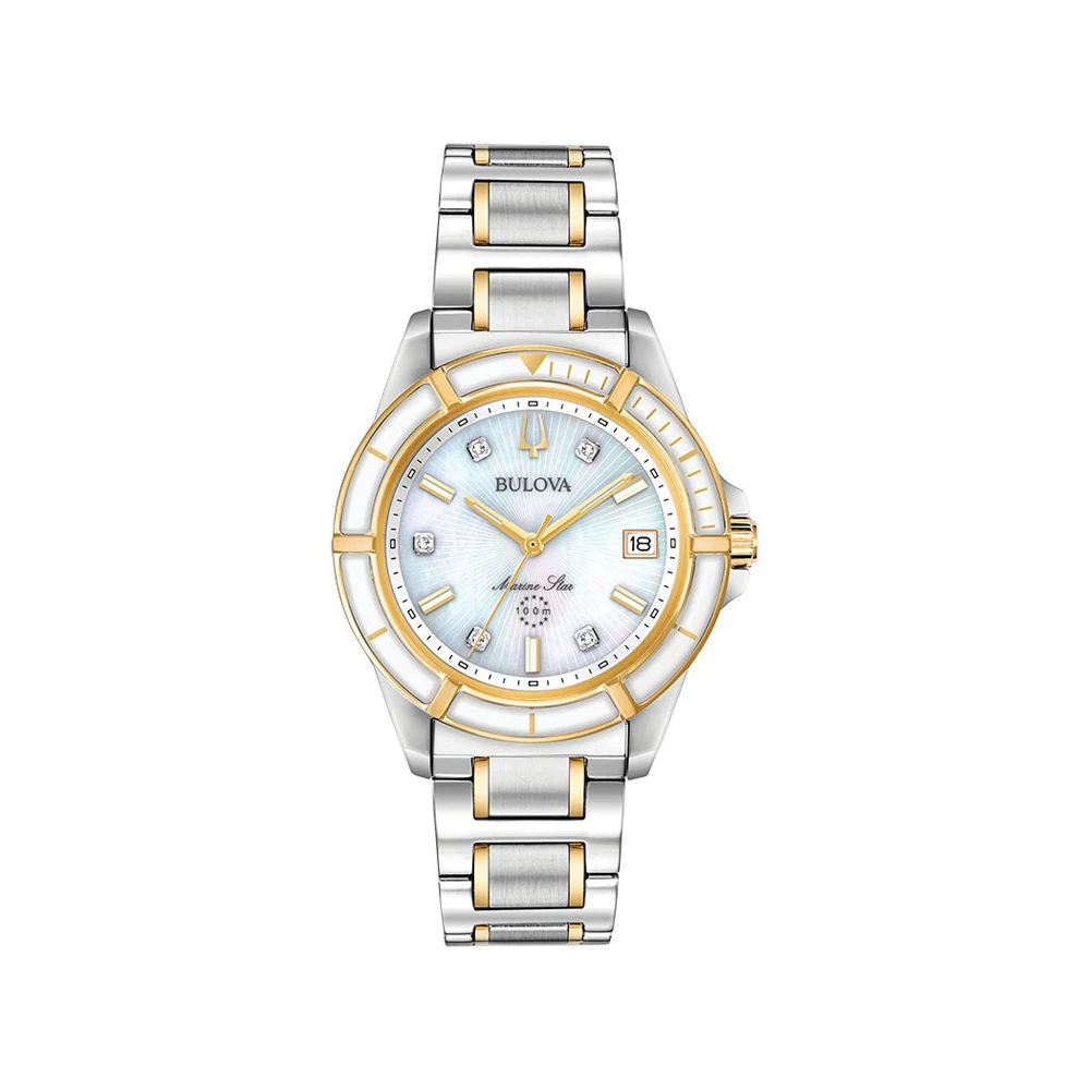 Женские кварцевые часы. Индикация даты в позиции трех часов. Корпус диаметром 34 мм выполнен из нержавеющей стали с частичным IPG покрытием. Белый перламутровый циферблат с центральной секундной стрелкой защищен минеральным стеклом. 5 кристаллов на месте меток. Рифленая заводная головка с защитой. Стальной браслет с частичным IPG покрытием с застежкой-бабочкой. Водонепроницаемость до 100 м.