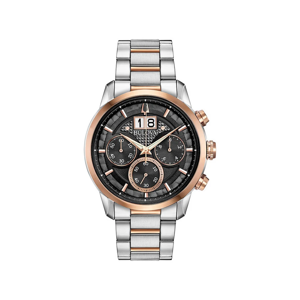 Мужские кварцевые часы с хронографом. Малые циферблат на 60 секунд, 60 минут, 10 часов. Большая дата в позиции 12 часов. Корпус диаметром 44 мм выполнен из полированной нержавеющей стали с частичным IP покрытием. Серый циферблат с позолоченными стрелками и метками защищен куполообразным минеральным стеклом. Стальной браслет с частичным IP покрытием. Водонепроницаемость до 30 м.