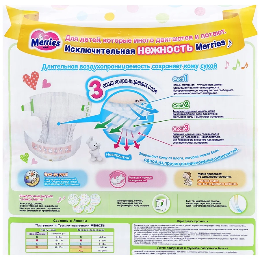 Инновационная технология трех дышащих слоев отлично выводит прелый воздух из подгузника, что позволит попке малыша всегда оставаться сухой.