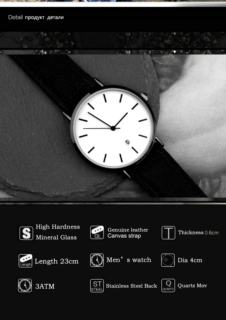 * См. Дополнительные сведения ниже * Корпус часов: сплав с тонким покрытием * Ремешок для часов: натуральная кожа или трикотажный материал из нержавеющей стали * Водонепроницаемость 30 метров отвечает требованиям повседневной жизни • Общая длина: 23 см Диаметр 4 см Толщина 0,7 см * Для предпочтений молодых людей Креативный дизайн/простота дизайна. Стильный черный стиль с изящным календарем просто и увеличивает очарование часов.