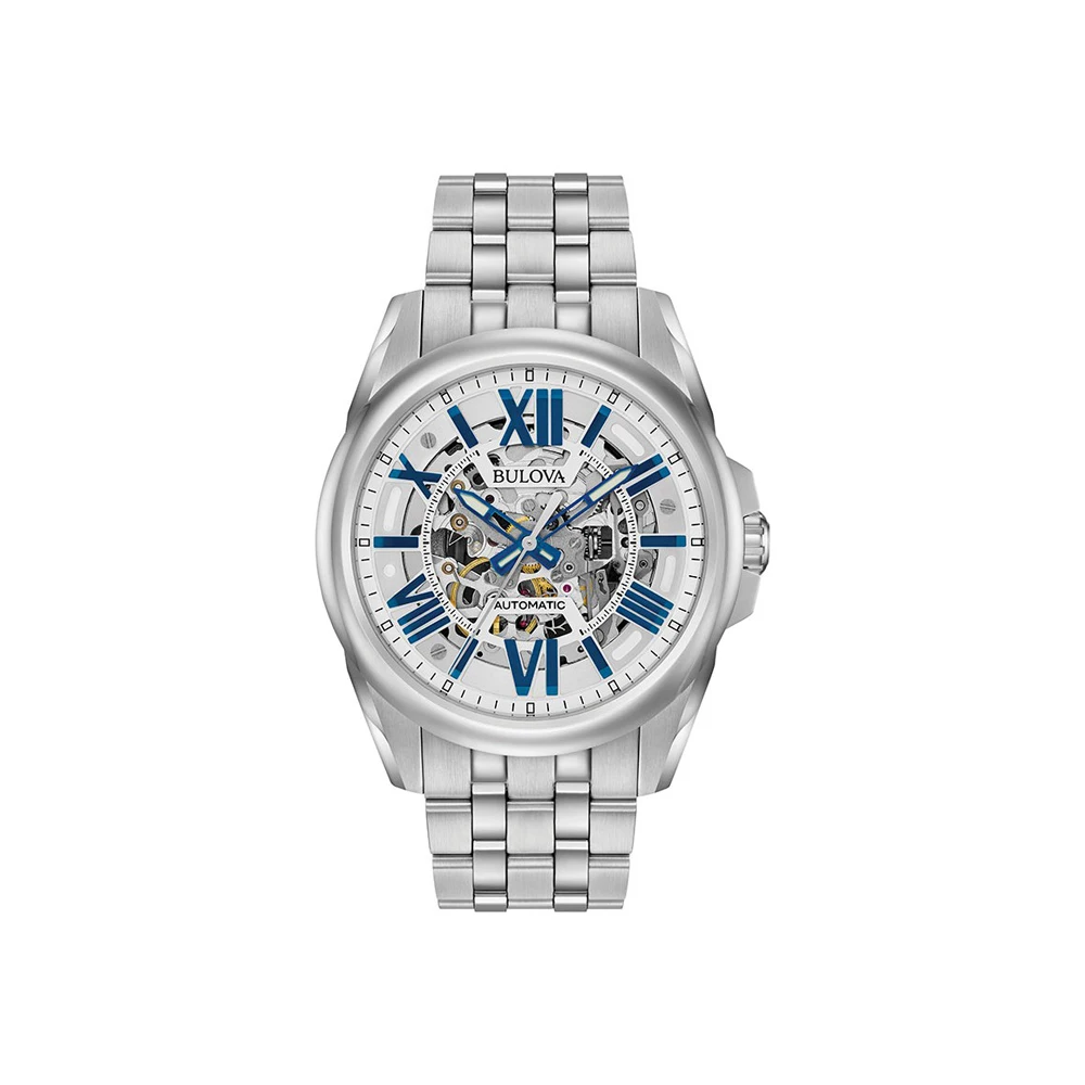 Mechanical watch with self-winding. The case and bracelet are made of stainless steel. Factory head with protection. Skeleton. Luminescent hands. Flat mineral glass. Water protection WR 100.