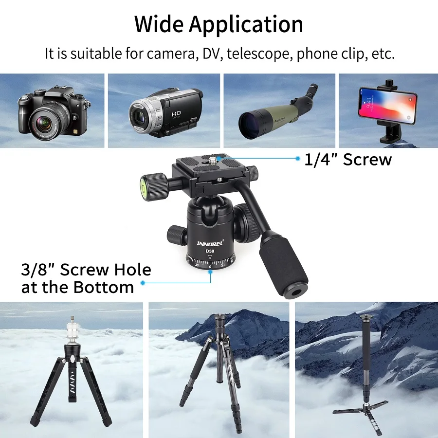 【Widely Applicable】3/8"screw holes at the bottom of the ball head and easy to install tripod, monopod, camera slider and mini tripod. With 1/4" screw thread on top, for installing camera, DV, mobile phone, telescope.