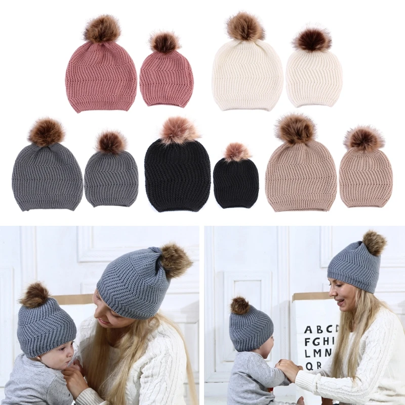 2 шт./компл., модные детские шапочки для родителей, Милая зимняя шапка с помпоном для малышей, шапка с меховым помпоном, теплая вязаная шапка для мамы, детей, шапка для новорожденного