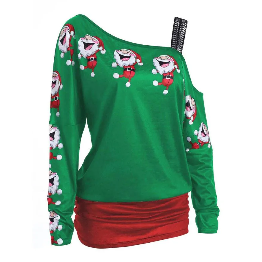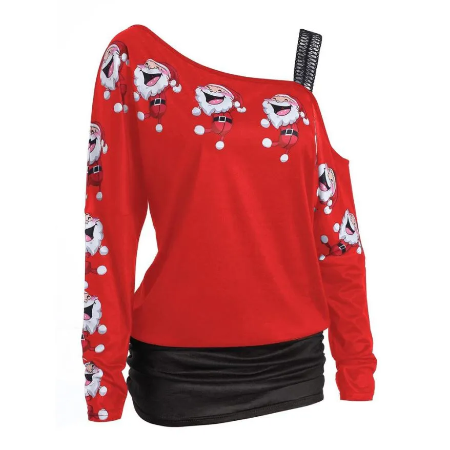 Женская рождественская Печать Топы с длинным рукавом с открытыми плечами Длинная блузка рубашка Топы