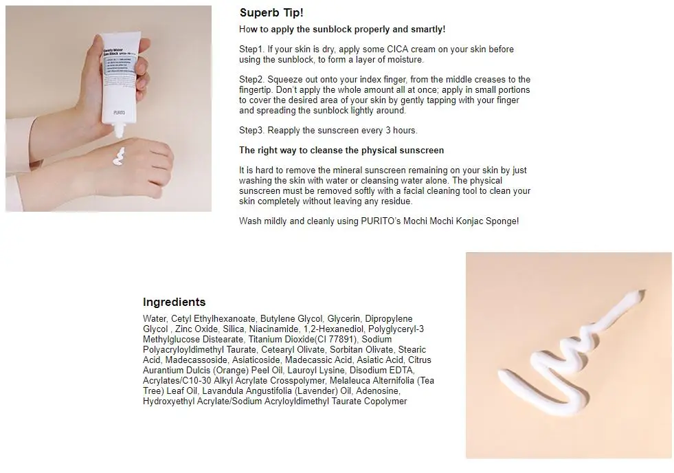 PURITO Comfy Water Sunblock's 70% основа под водой и основная технология заставляет sunblock замачиваться в кожу, предотвращая подъем или размазывание макияжа. Перед нанесением макияжа можно использовать солнцезащитный козырек.