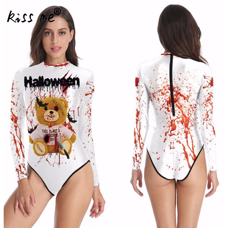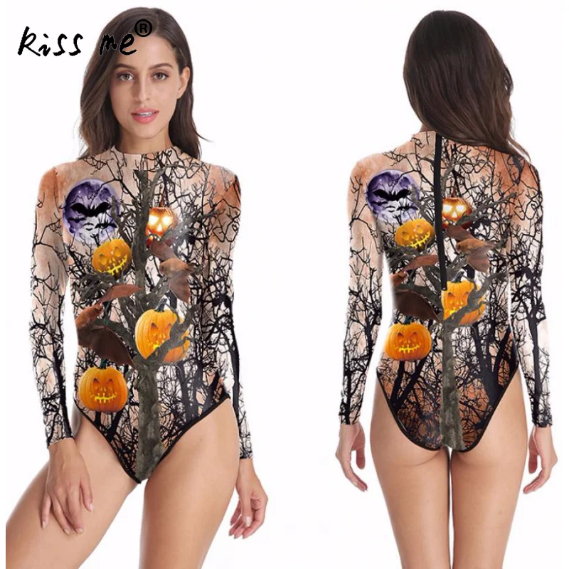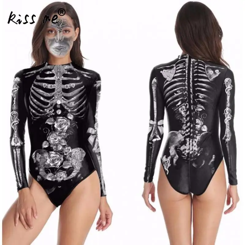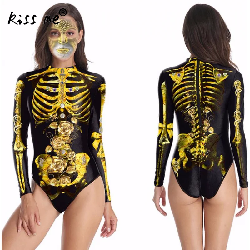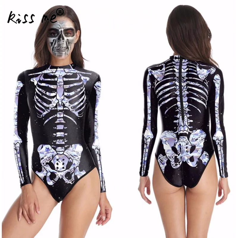 Skeleton Pattern Rash Guards Long Sleeve One Piece Swimsuit Surfing Suit Punk Style Swimwear Quick Dry Bathing Suit