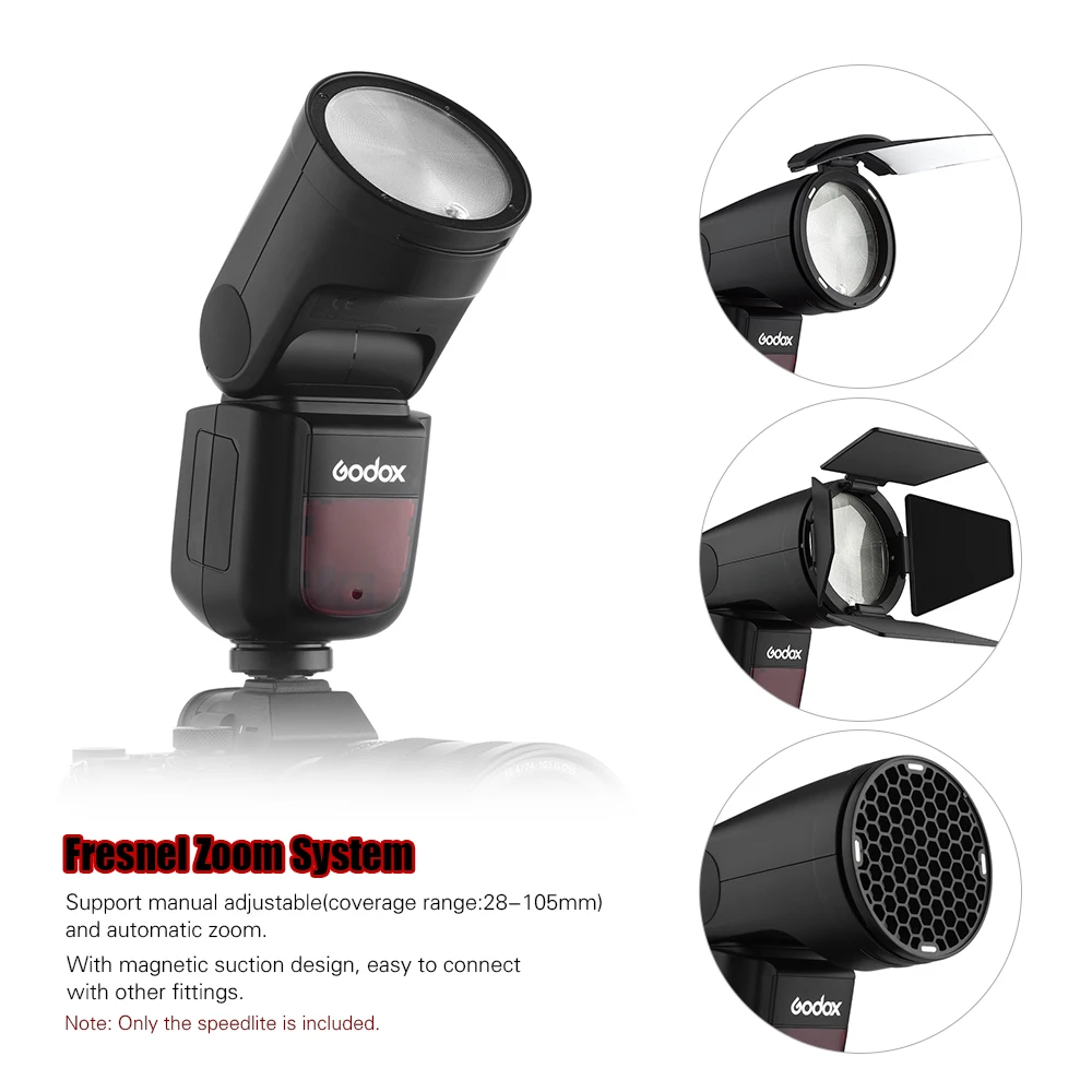 Профессиональная вспышка Godox V1S camera speedlite (версия Sony), с круглой головкой лампы, равномерное и мягкое освещение, отличное восприятие стерео, обеспечивает вам необыкновенные фотографические эффекты. Поставляется с набором аксессуаров Godox AK-R1 Карманный светильник вспышки, более практичный.