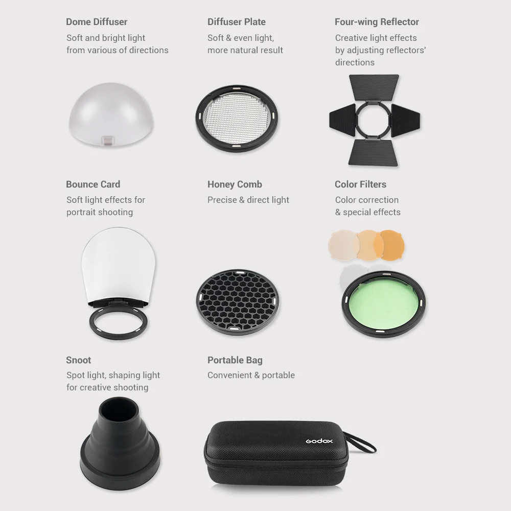 Поставляется с Godox AK-R1 эксклюзивная карманная вспышка светильник набор аксессуаров, в том числе насадка для рассеивания света, крыло отражателя, пчелиные соты, тубус осветительного прибора, и т. д., а также для того, чтобы достичь простая и быстрая установка, и предоставить вам несколько большое светильник ing эффекты.