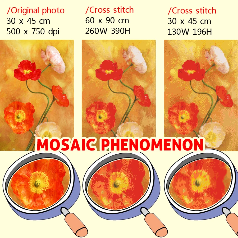 Поскольку количество цветов вышивки крестиком обычно составляет 30-45, эффект рисунка после завершения вышивки определенно не так хорош, как на оригинальном фото, и иногда узор может быть искажен. Это нормально. Однако, как правило, эффект узора крестиком большего размера лучше, чем у узора меньшего размера.