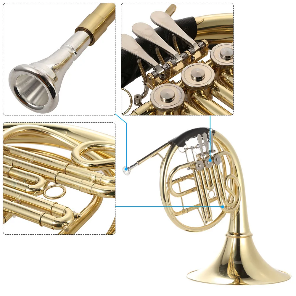 Французский рог имеет Латунное отверстие для отзывчивого насыщенного звука, а12"Звонок для оптимальной звуковой проекции,3 твердых поворотных клапанаДля плавного действия клавиш и лакированного покрытия. Идеально подходит для студентов, начинающих и преподавателей.