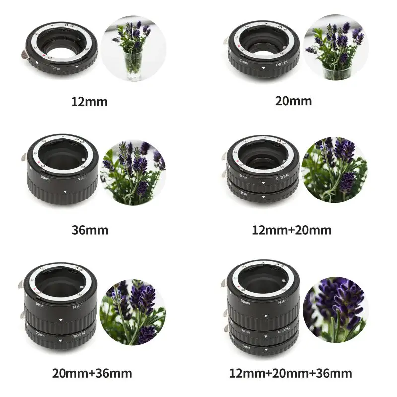 Этот N-AF набор макроудлинительных трубок разработан специально для камер Nikon, 3 удлинительных трубки входят в комплект-12 мм, 20 мм, 36 мм адаптеры есть всего 8 комбинаций, вы можете использовать индивидуально или в любой комбинации для получения желаемого увеличения он перемещает объектив дальше от пленки или цифрового датчика. Чем дальше объектив, тем ближе фокус, чем больше увеличение этой удлинительной трубки не влияет на качество изображения, так как внутри нет оптики, автоматические линзы можно использовать с самой широкой открытой апертурой только для NikonD3000,D3100,D3200,D3300,D5000,D5100, d5200, D5300,D7000,D7100,D7200,D300,D600,D610,D700,D800,D3X,D4,D4S,DF цифровая SLR Камера посылка включает 1 * Макро Удлинитель