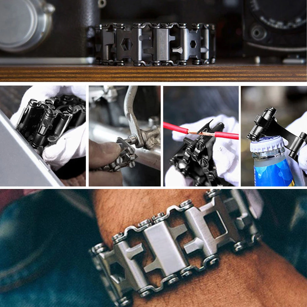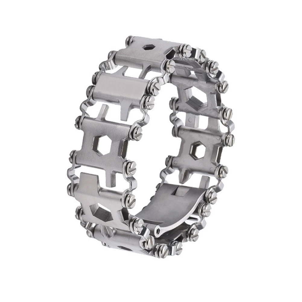Особенности: Отправляется куда угодно. На самолете, в школу, на ужин, в офис, в Диснейленд с семьей, Пешие прогулки в Патагонии, или Рыбная ловля лосося на речке Альта в Норвегии. Подходит более функционально: различные ключи коробки, шестигранные диски, плоские и Phillips отвертки, кислородный гаечный ключ, карбидный стеклянный выключатель, sim-карты, режущий крючок, адаптер привода гнезда и открывалка для бутылок. Материал: нержавеющая сталь Цвет: серебристый, черный Длина: 21,74 см Ширина: 3,05 см Толщина: 6 см Посылка включает в себя: 1 x Многофункциональный защитный браслет